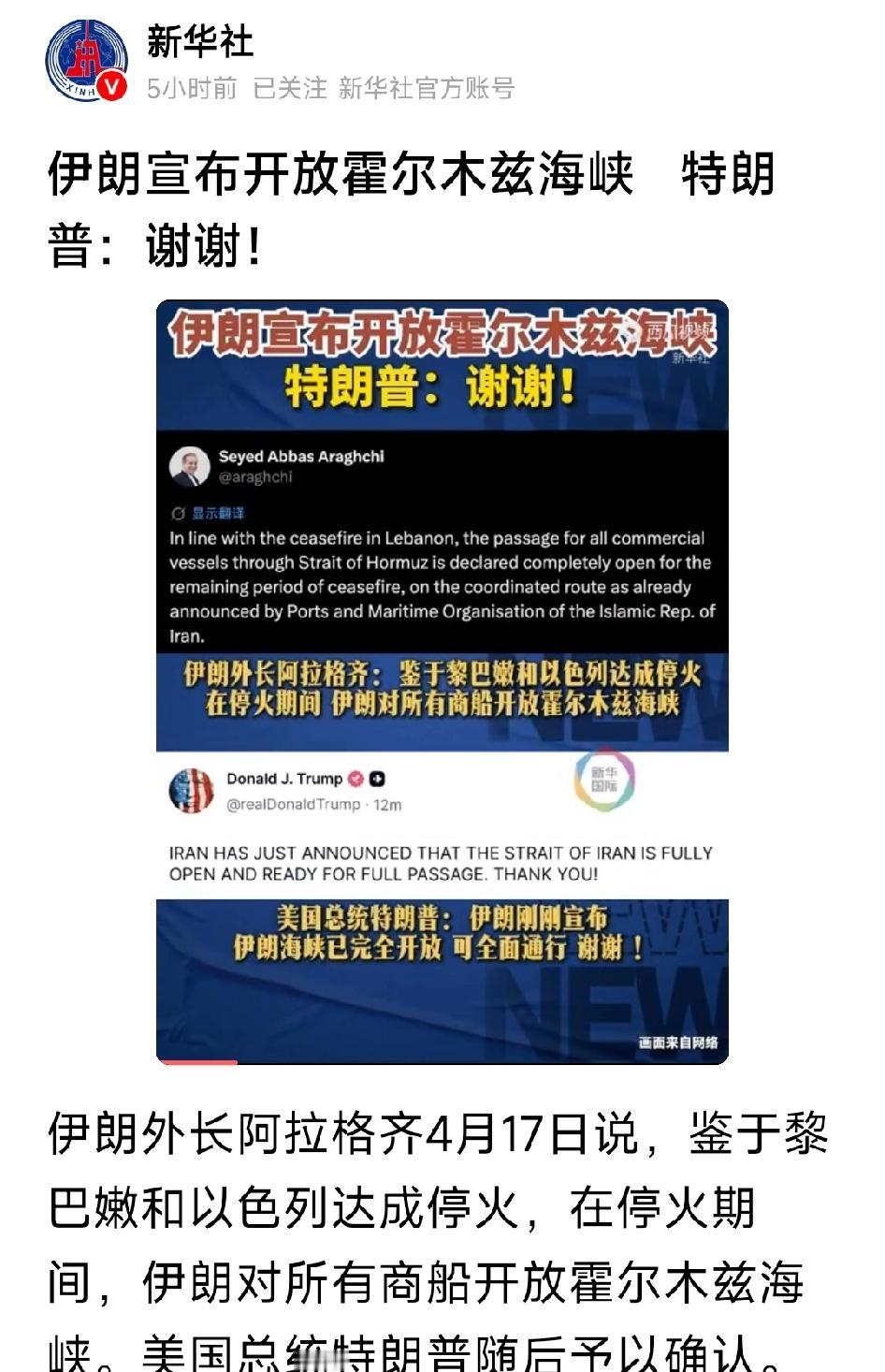 霍尔木兹海峡素有“世界油阀”之称,是全球能源运输的核心通道,此前地区冲突升级,海峡通航受限,直接牵动国际油价波动、全球供应链承压。伊朗此次开放海峡,既是对黎以停火协议的响应,也是缓和地区对峙、缓解外部压力的务实之举,同时牢牢把控通航主导权,要求商船依照既定协调路线通行,并非无条件全面放开。