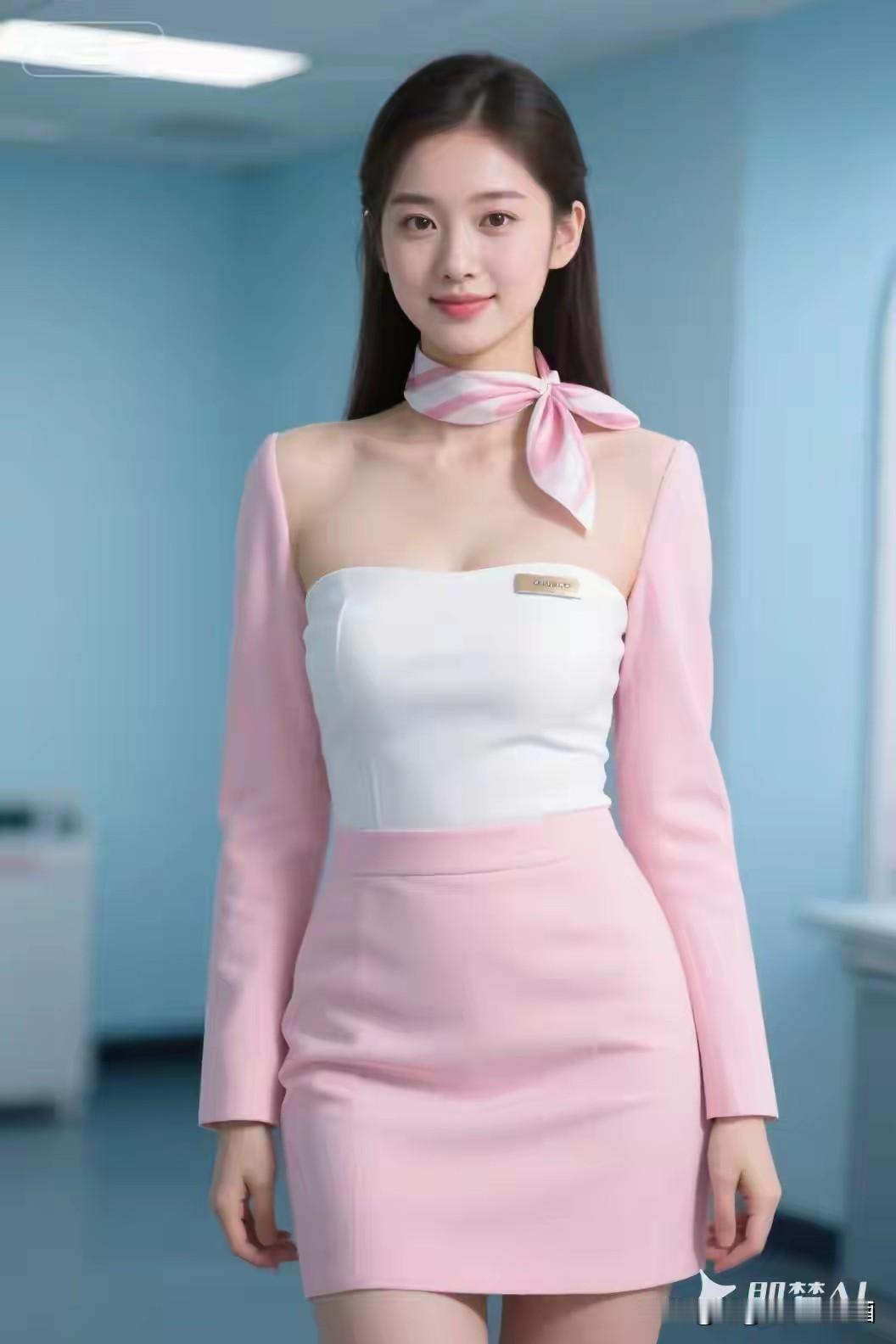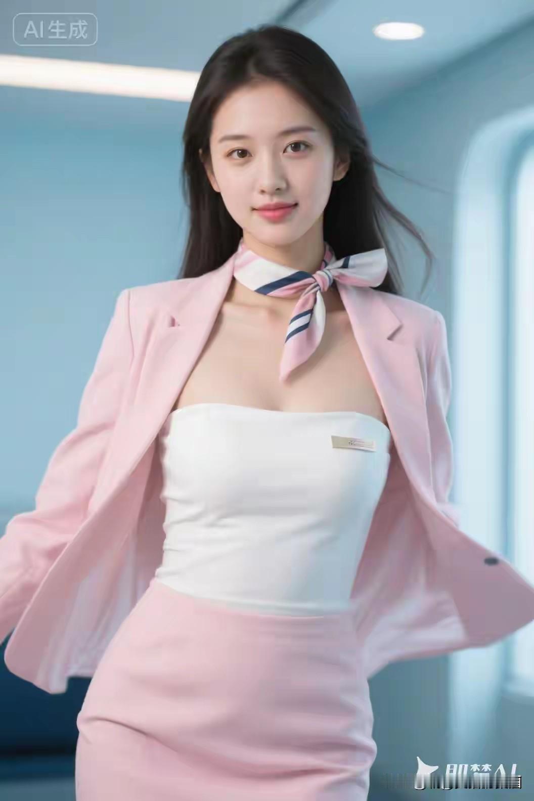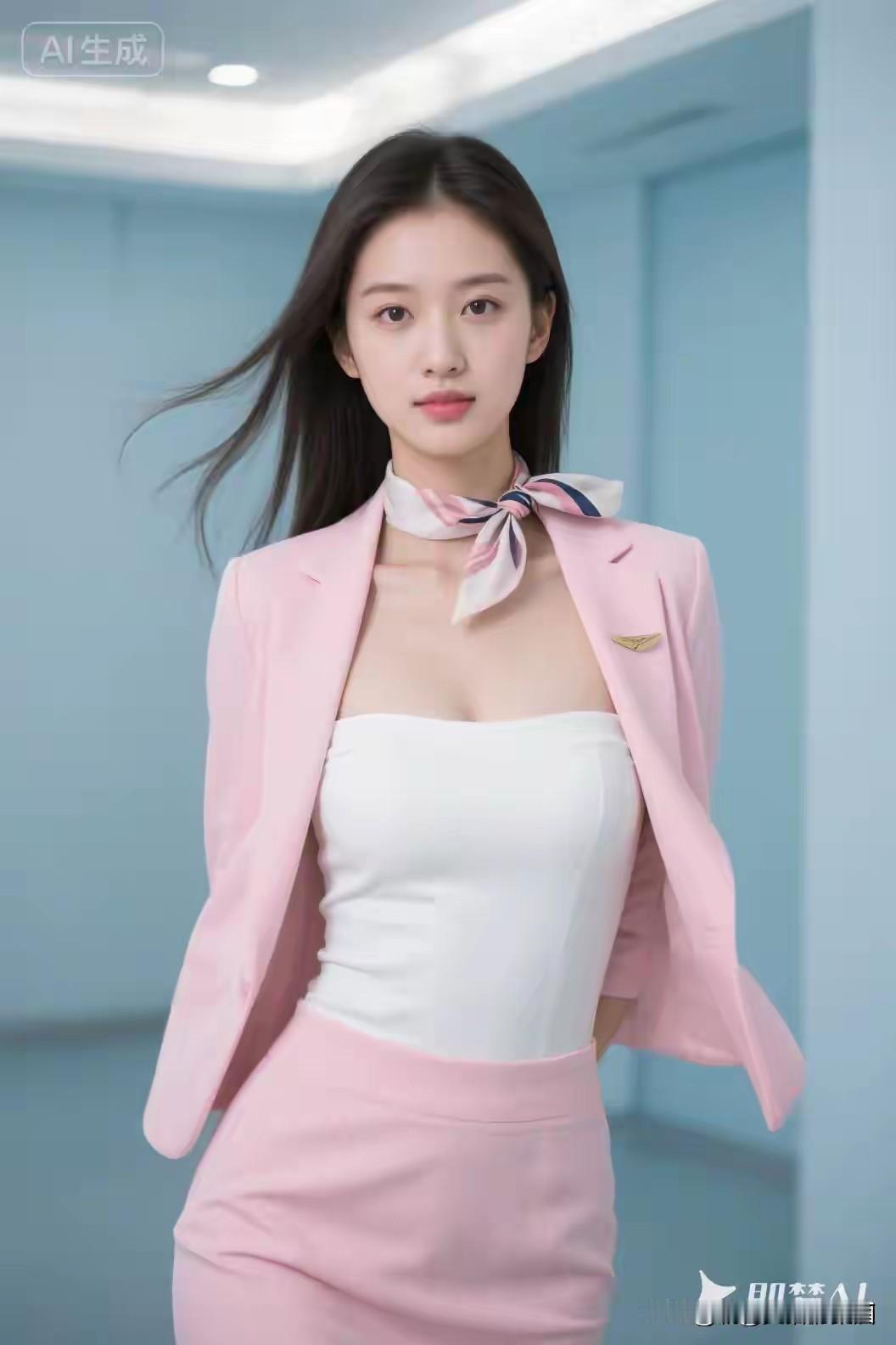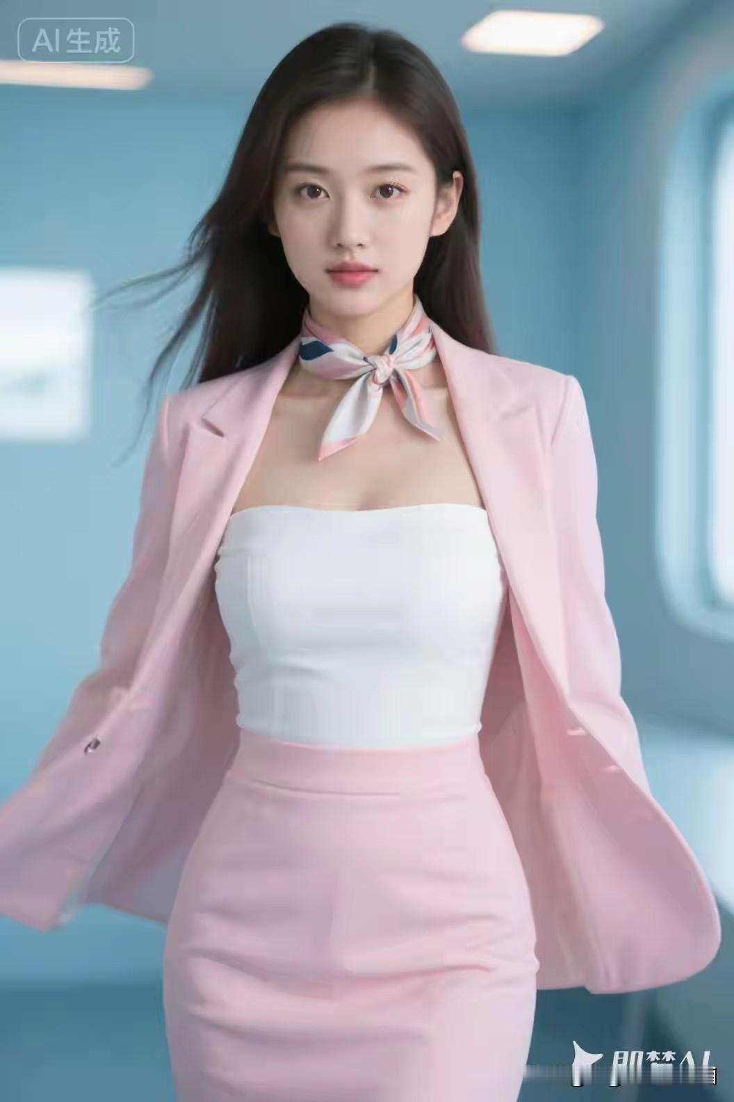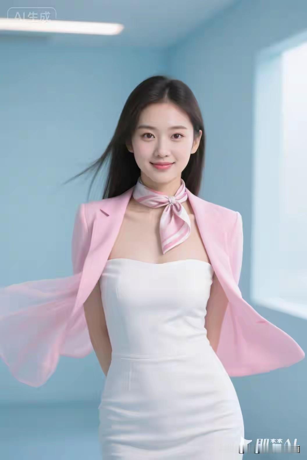 这位女士穿着粉色外套和白色连衣裙,搭配粉色丝巾,看起来非常优雅。