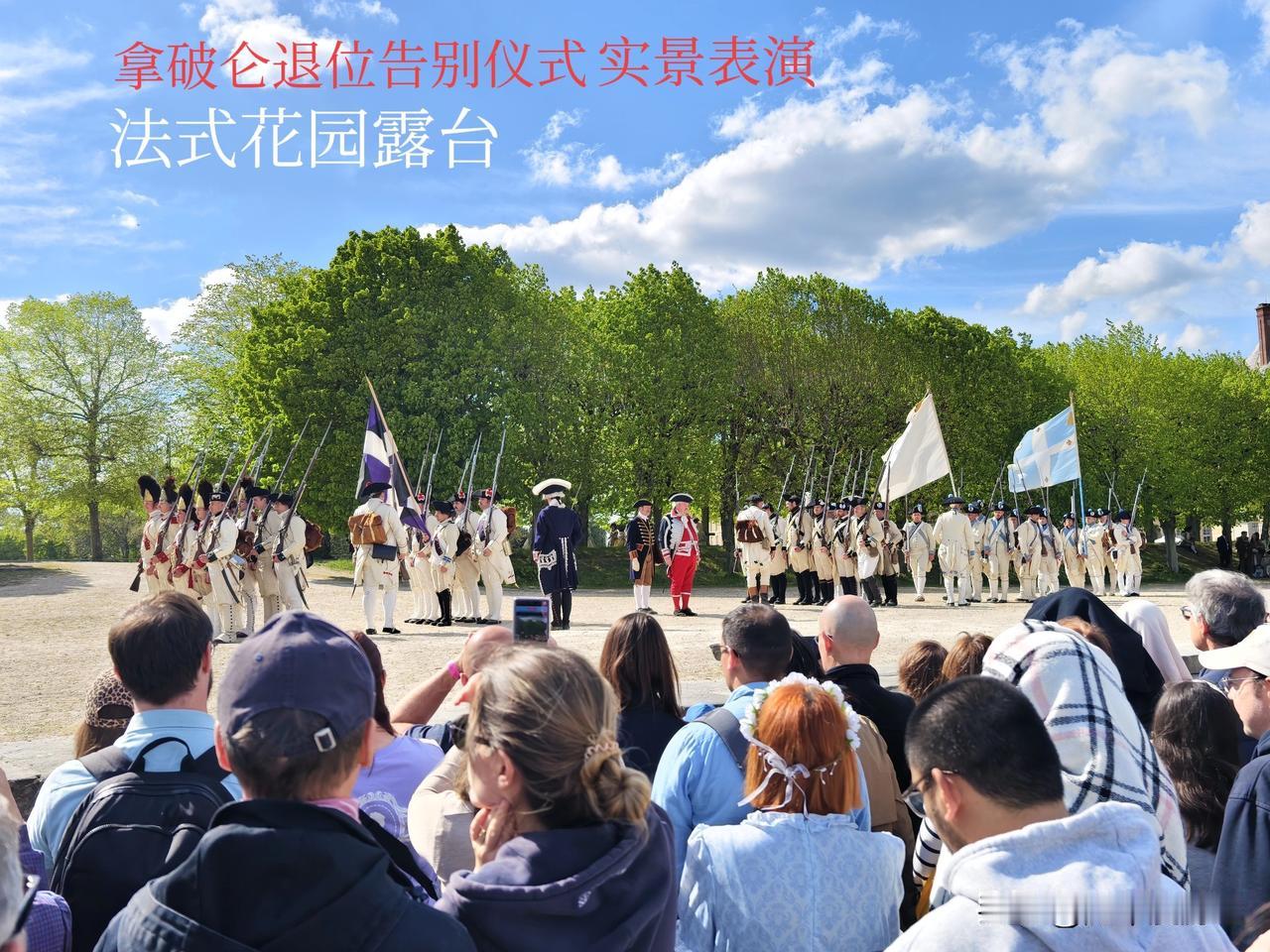 枫丹白露的实景演出,气氛庄严、沉重,“拿破仑”扬起高傲的头颅,诚挚地向追随他的卫兵们念告别词,一种虽败犹荣、不亢不卑的气势。