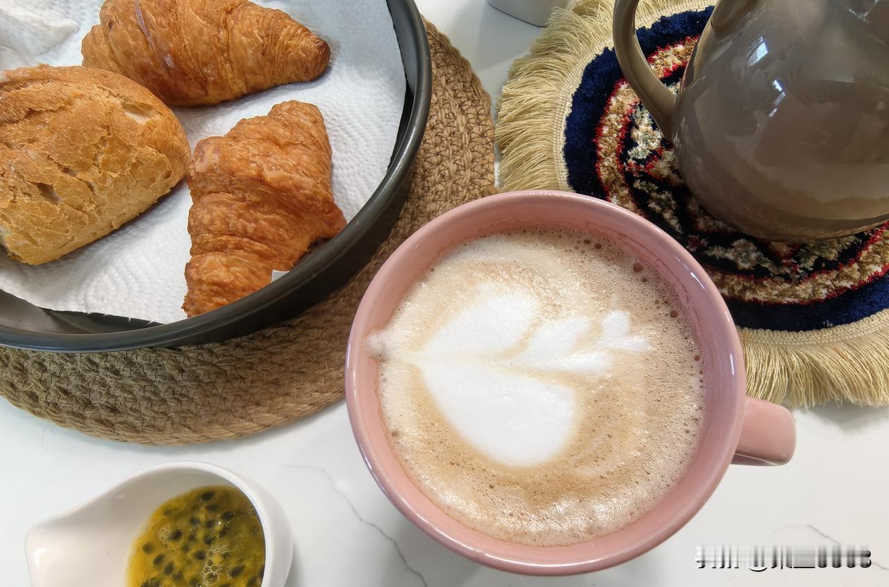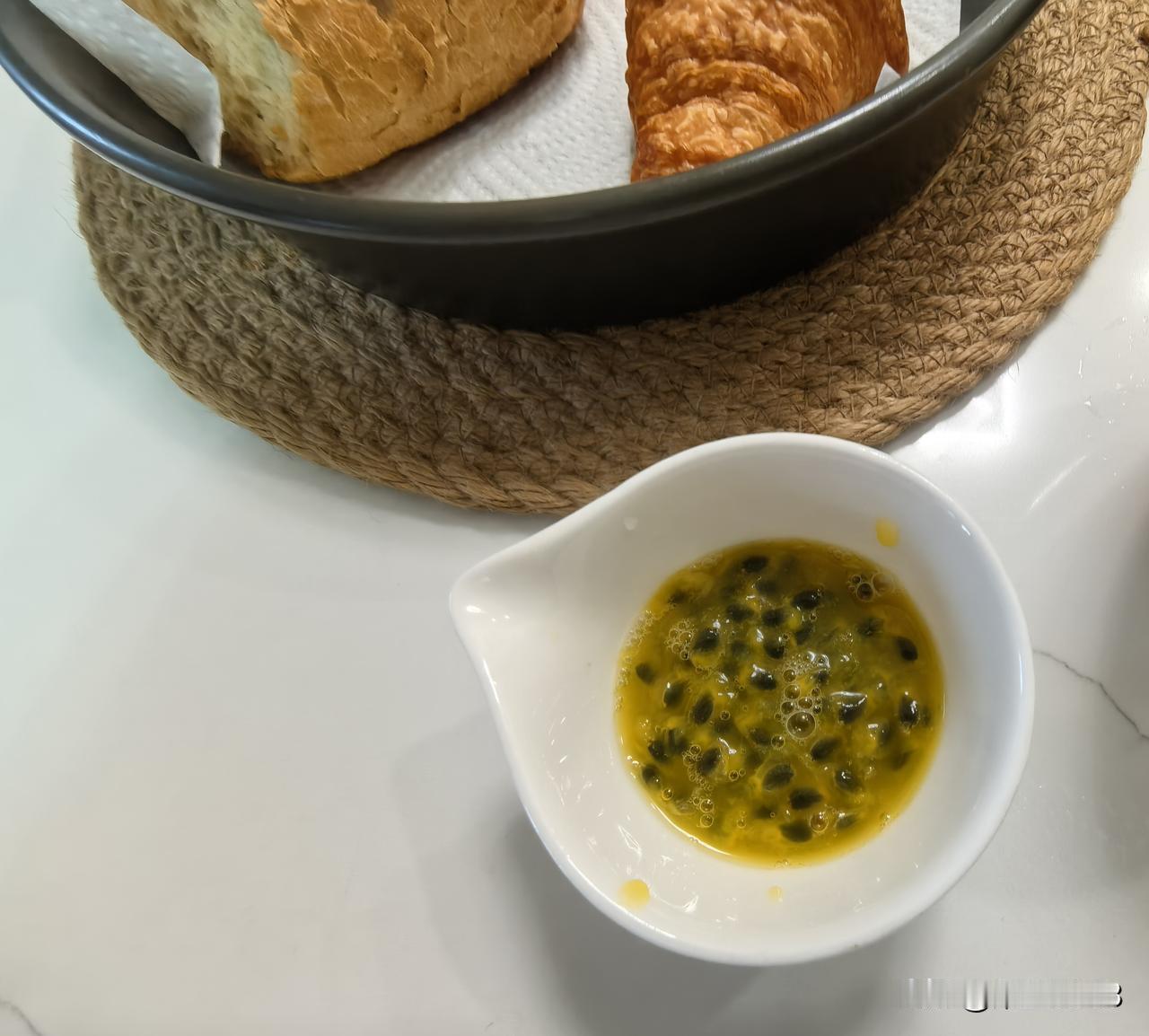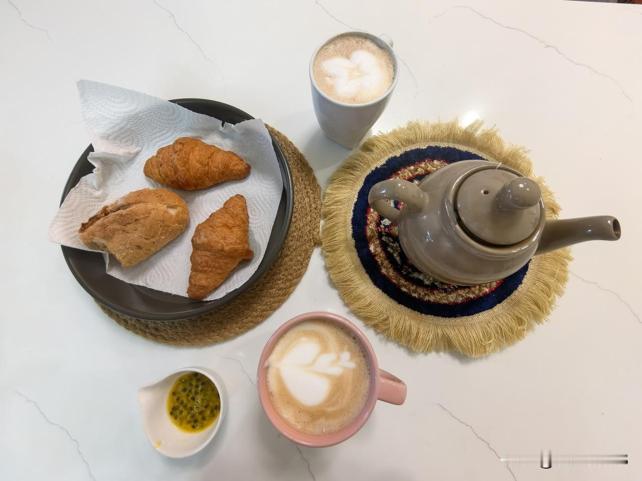 今天的早餐特别简单,咖啡,可颂,一小节法棍,一壶红茶,一个百香果。