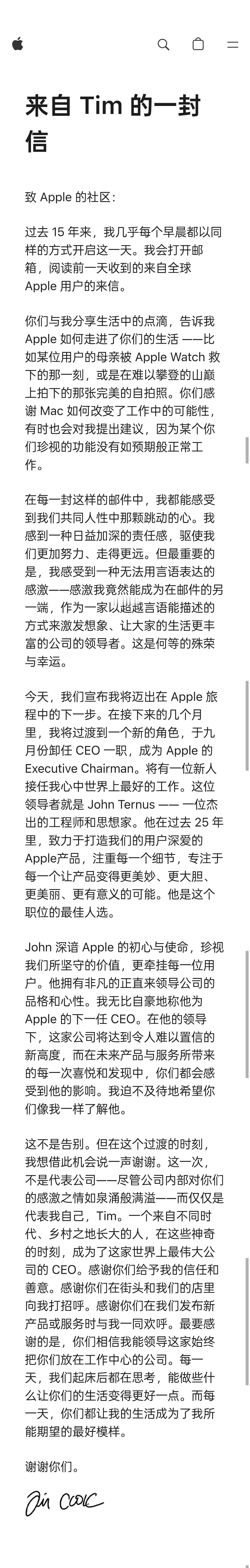 库克不再担任苹果CEO 苹果官网首页刊登了 Tim Cook 的一封信,正式宣布卸任 CEO。