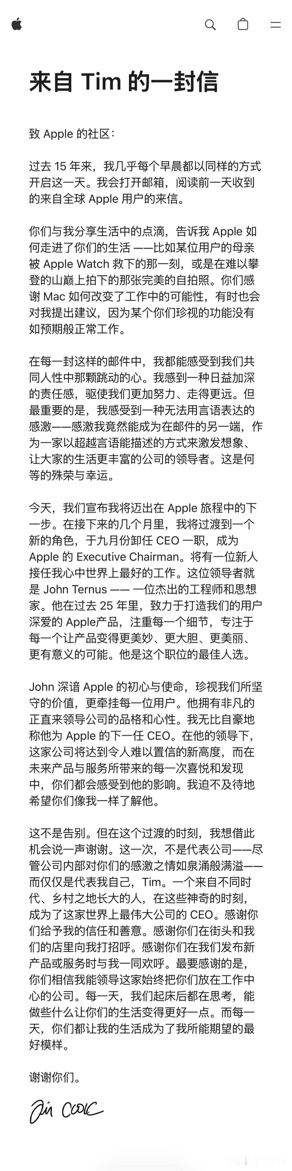 有些突然,库克宣布不再担任苹果 CEO,成为 Apple 的 Executive Chairman(执行主席),下一任苹果 CEO 将由 John Ternus 担任,今年 9 月 1 日正式接任。