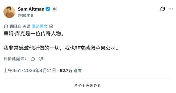1、OpenAI CEO萨姆·奥特曼(Sam Altman)在X上发帖称:“库克是一位传奇。我非常感谢他所做的一切,也非常感谢苹果。”