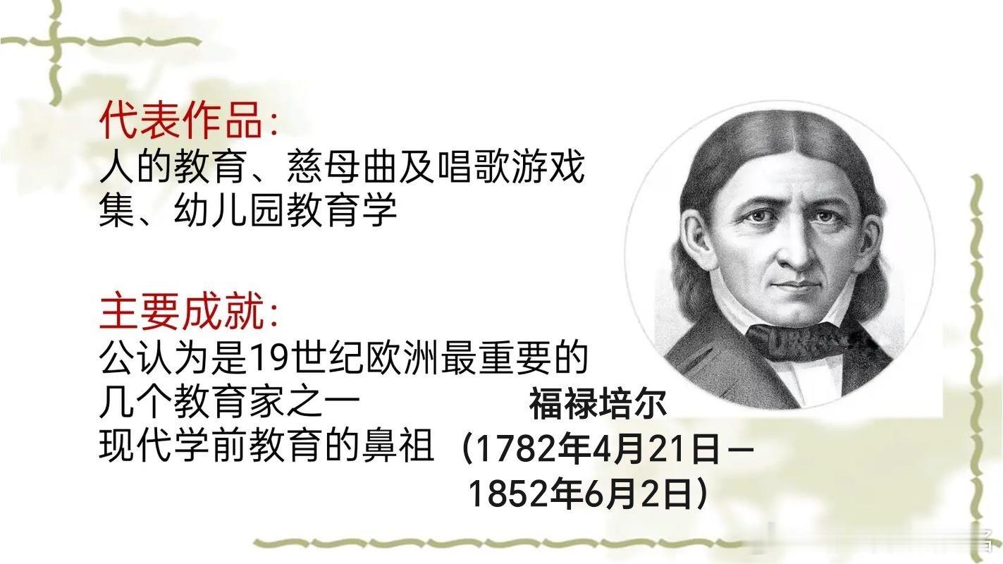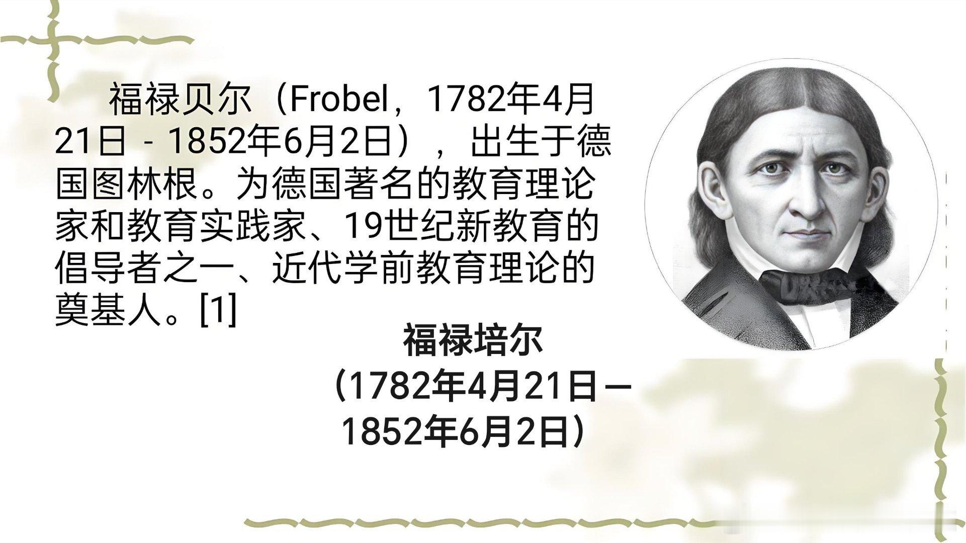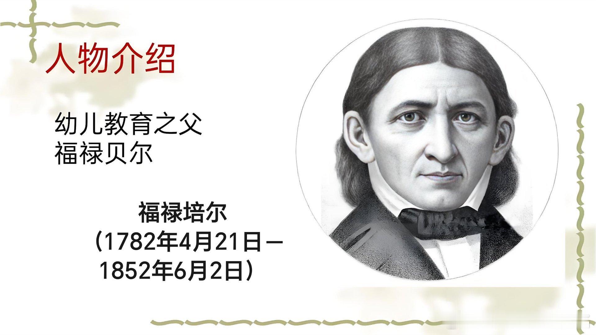 福禄培尔(1782年4月21日-1852年6月2日),德国教育家,出生于图林根奥伯韦斯巴赫,毕业于哥廷根大学。现代学前教育体系创始人、幼儿园创始人,首创“幼儿园”教育机构并设计开发教具“恩物”,代表著作包括《人的教育》《幼儿园教育学》等。其教育理论以德国古典哲学和早期进化思想为主要根据,以裴斯泰洛齐的教育主张为教育思想的主要渊源,反映了他对于哲学和教育学的基本观点。1852年6月2日,福禄培尔逝世。