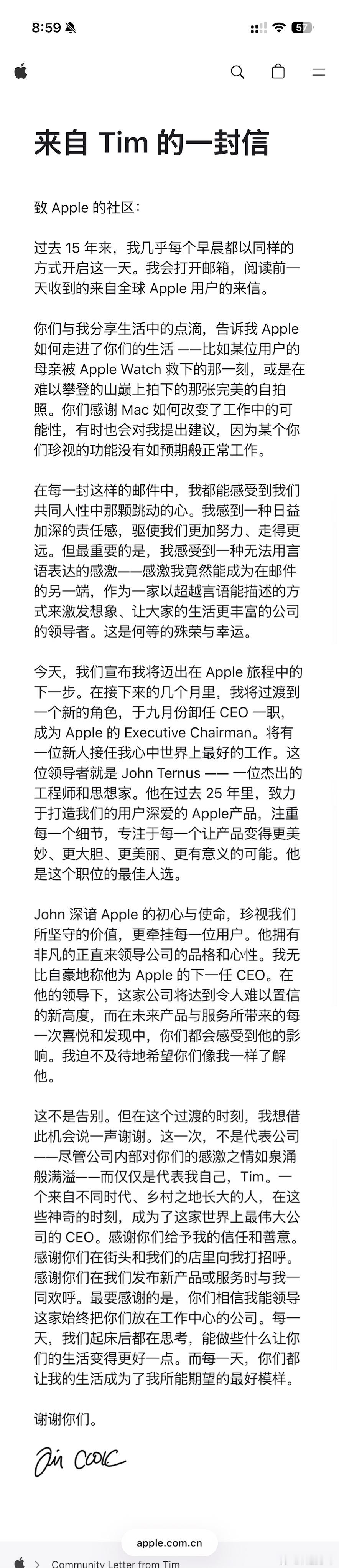 早上刚刷到苹果要换 CEO 的新闻,Tim Cook 说自己做了15年苹果CEO,每天早上起来第一件事,就是看全球用户发来的邮件。大家跟他分享产品怎么走进了生活,比如Apple Watch救了人,或者设备帮到了工作,他说从这些信里感受到很多,也一直满是感激。