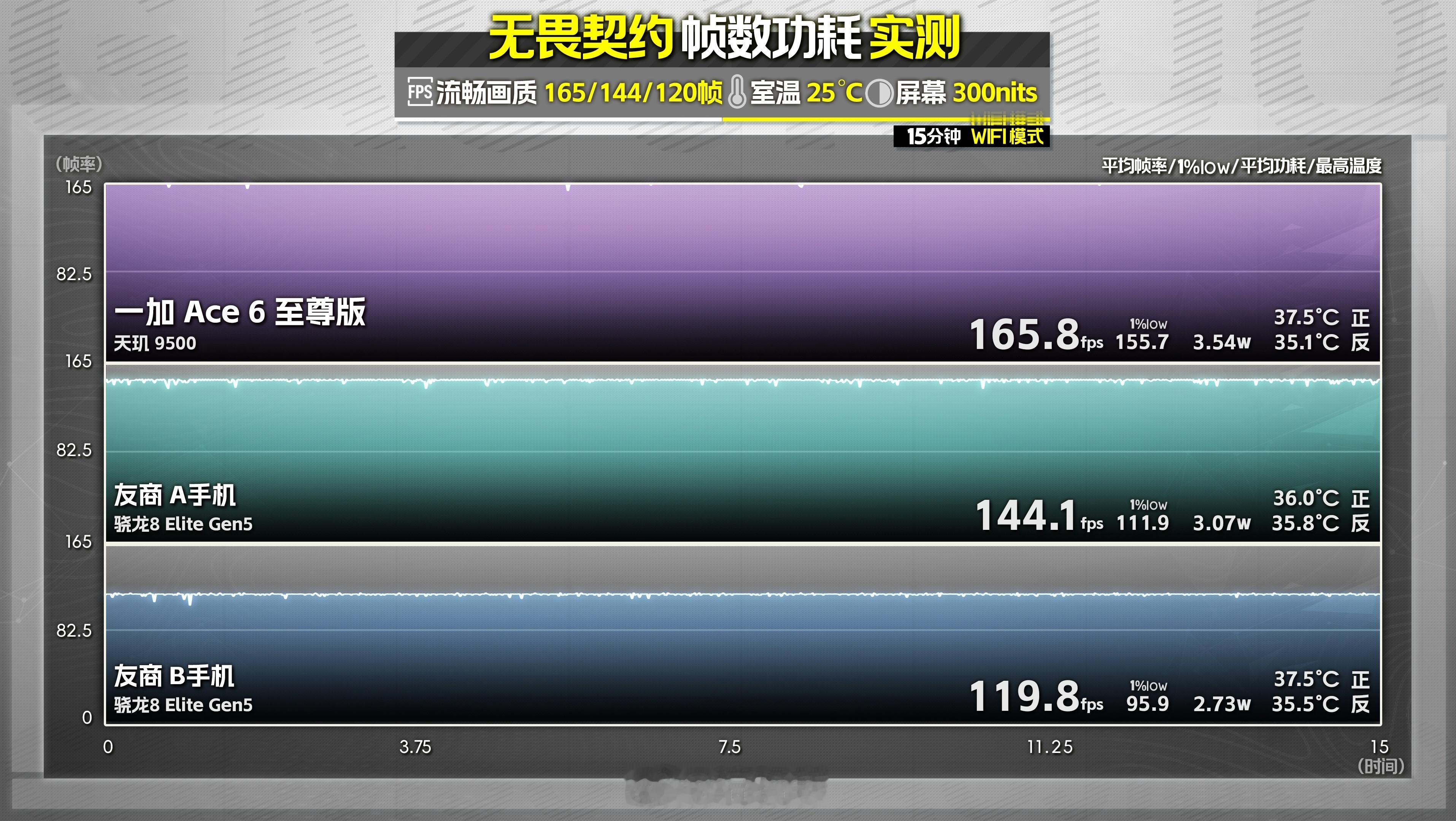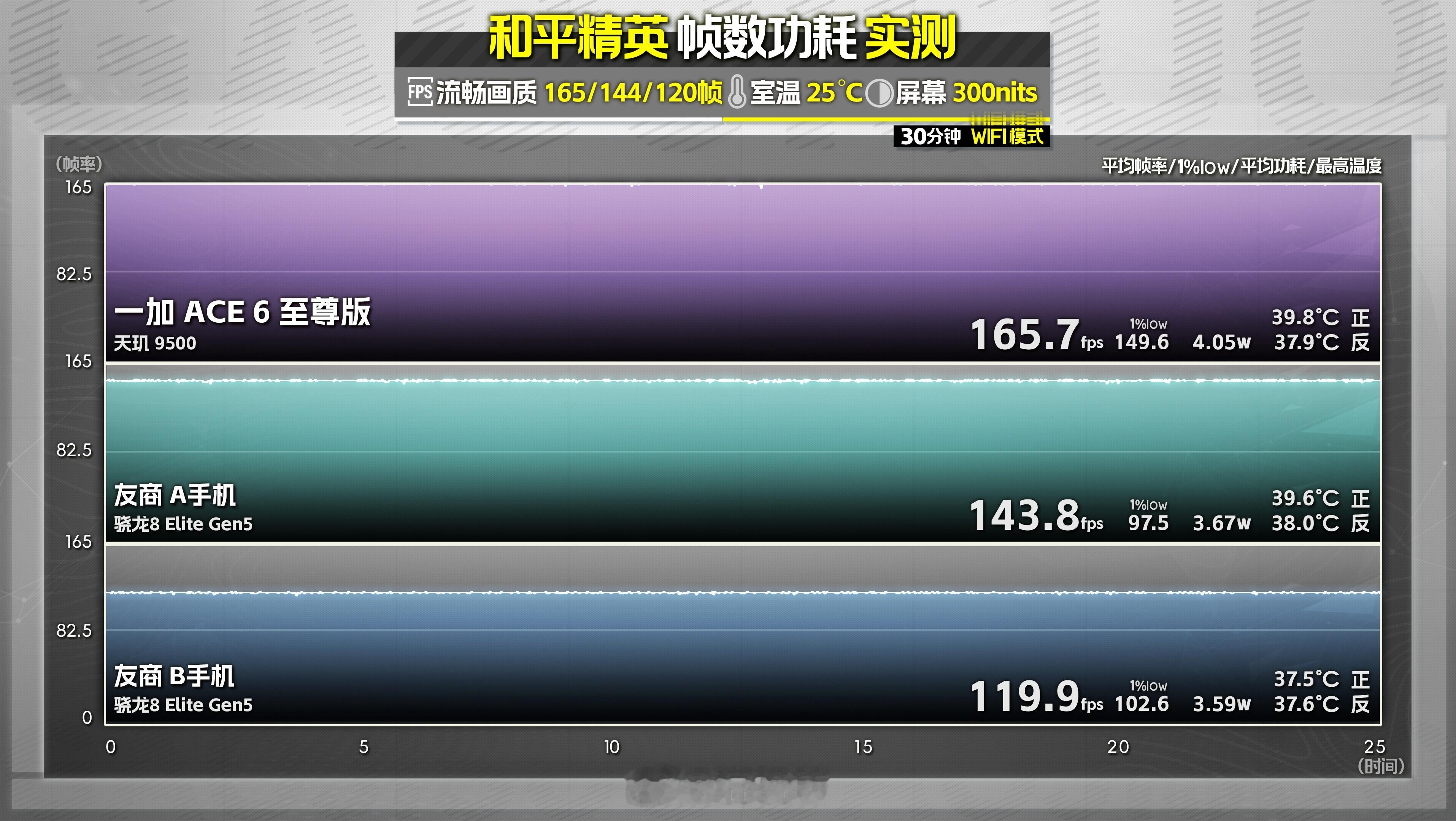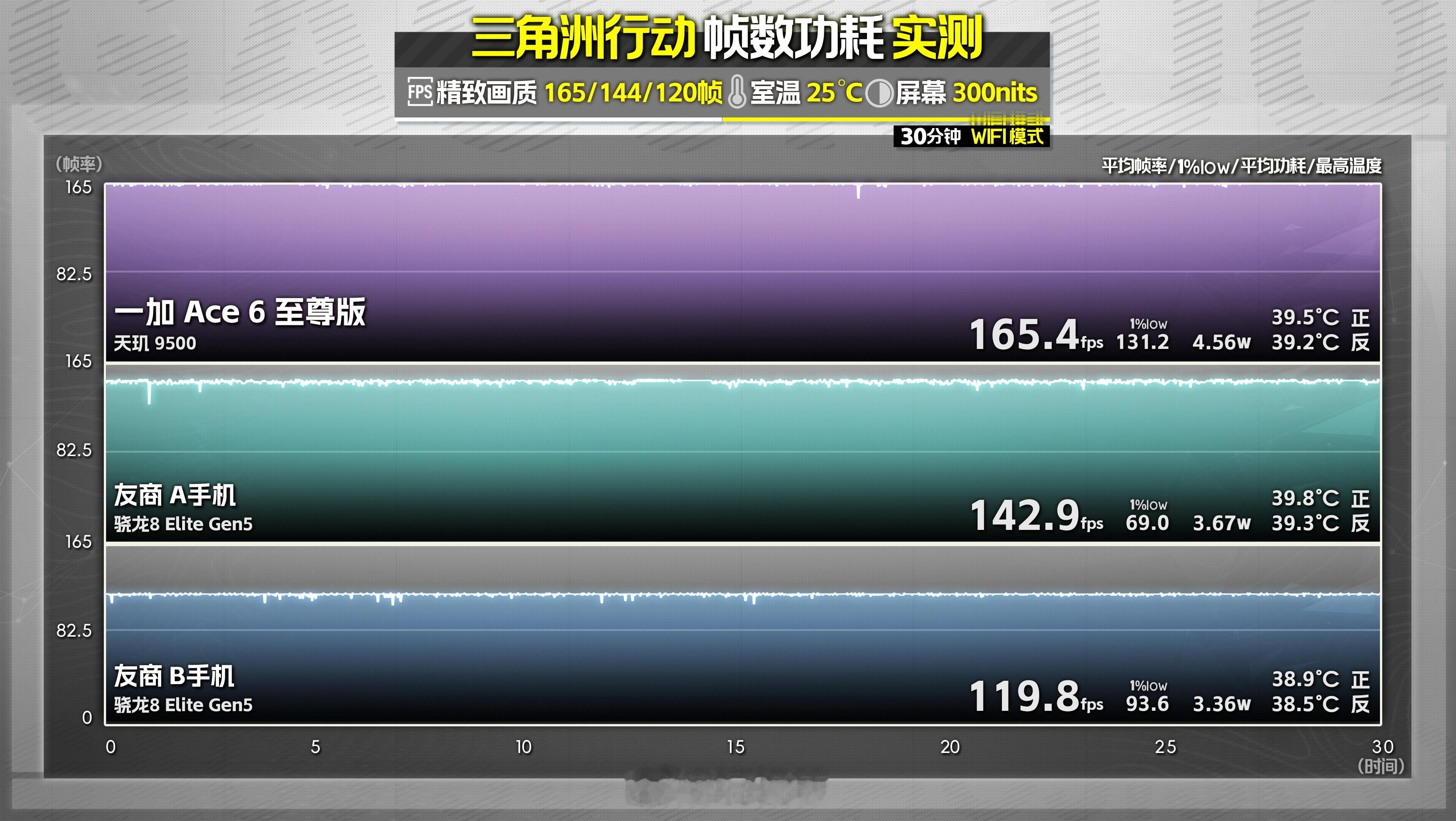 从初步测试数据来看,一加「全新一代风驰游戏内核」加上天玑 9500旗舰移动平台超强的GPU性能,深度调校后,一加 Ace 6 至尊版在4款热门的国民级射击手游中都能保持全程165满帧,并且1% Low帧表现相当强势。