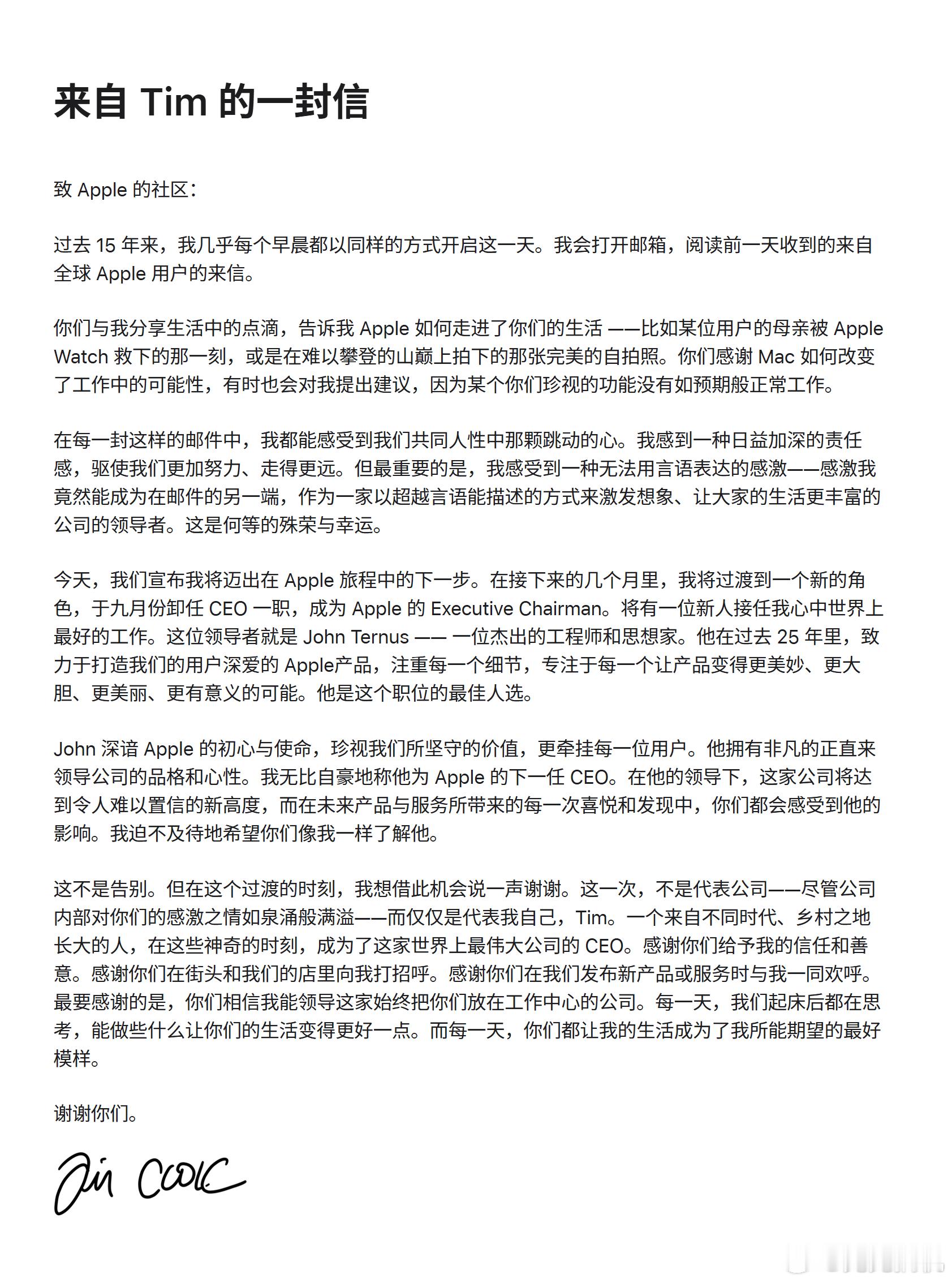 之前曾负责过苹果的硬件工程,9月1日既接任苹果CEO同时也进入董事会。