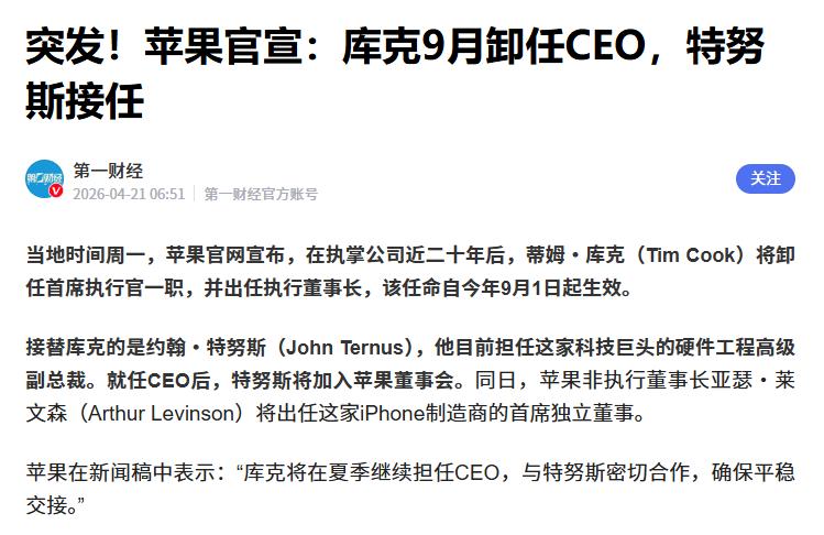 据媒体报道,在成为苹果掌门人近20年后,库克即将卸任首席执行官一职,转为执行董事长。值得一提的是,未来接棒库克的是约翰・特努斯,他目前担任的职位是硬件工程高级副总裁。