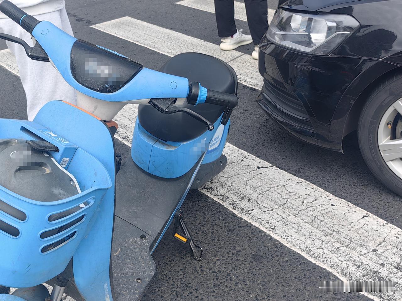 【实拍!石家庄中山路平安大街交叉口 人行横道发生轿车与电动车碰撞事故】今天上午10点左右,石家庄中山路与平安大街交叉口,一辆黑色轿车在人行横道上与共享电动车发生碰撞,现场车辆受损,事故正在处理中。