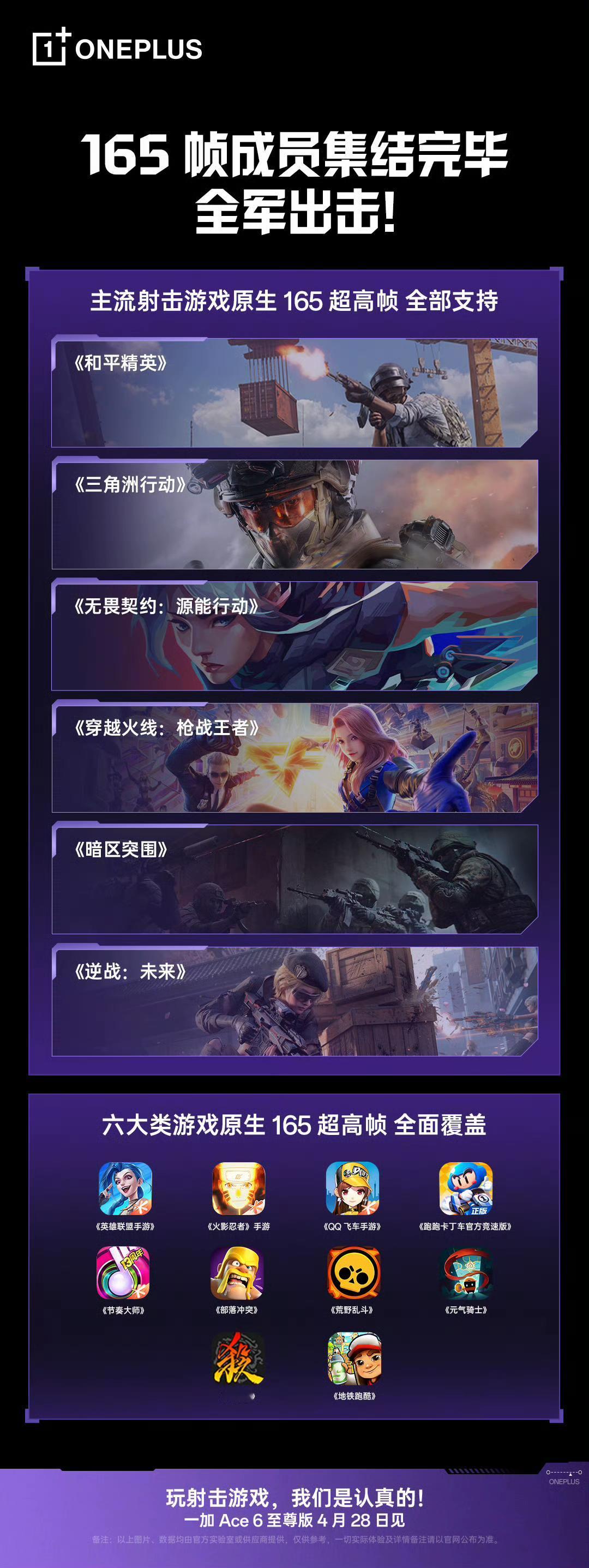 一加 Ace 6 至尊版各种 FPS 手游的帧率都已经顶满了,还首发: 《逆战:未来》原生 165 帧+精致画质; 《英雄联盟手游》原生 165 帧+最高画质。 不知道米系三杰的游戏表现咋样,原神、星铁、绝区零