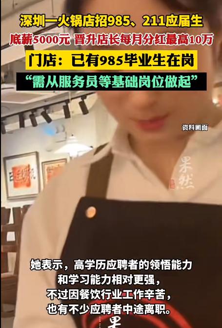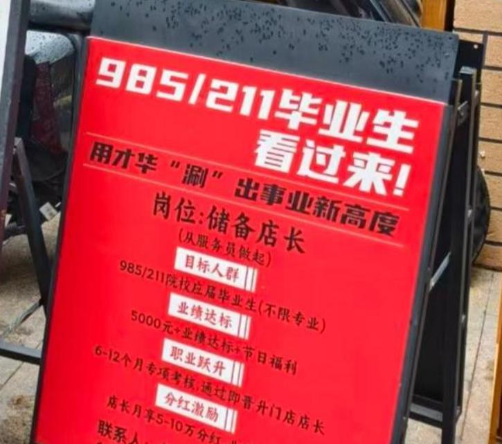 你敢信?985毕业,月薪5000,从端盘子干起!这是深圳一家火锅店门口实实在在贴出来的招聘启事,招聘启事上赫然写着“985/211毕业生看过来”,招聘岗位为储备店长,面向985/211院校应届毕业生,不限制专业。业绩达标的话底薪5000元,还有业绩叠加和节日福利。最扎眼的标注在下面:要从服务员做起,612个月专项考核通过即晋升门店店长,店长月享5万10万分红,业绩无上限。