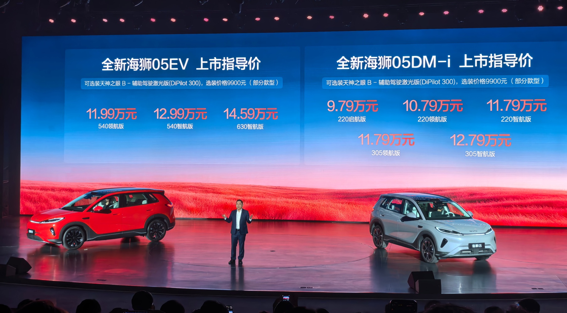 刚从现场回来,趁热聊几句。先说价格,全新海狮05EV 11.99万-14.59万,DM-i 9.79万-12.79万,这个价格放在A级SUV市场确实有点狠。现场我特意留意了一下配置表,全系标配超100项,入门版没有明显的"丐版感",这点要给好评。