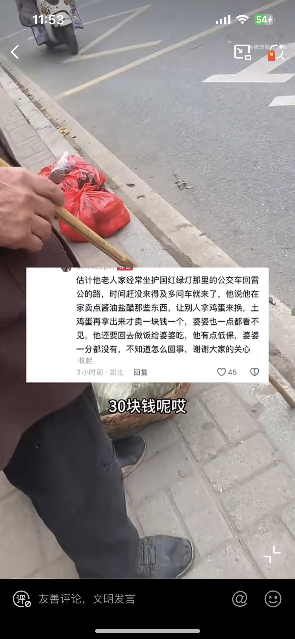 湖北安陆街头,一个盲人大爷被人偷走 30 个土鸡蛋,太令人气愤了。盲人大爷自己养的鸡生的土鸡蛋,摸索着提到县城来卖,一块钱一个。却有一个缺德的人跑过来买鸡蛋,挑了 30 个。假装要给大爷付款,却悄悄地溜走了。欺负大爷是盲人看不到,更不可能去追,看得出大爷有点伤心。攒的这些土鸡蛋卖点钱,好换点油盐。偷鸡蛋的人实在太无耻,当他吃这个鸡蛋的时候,良心真的安吗?