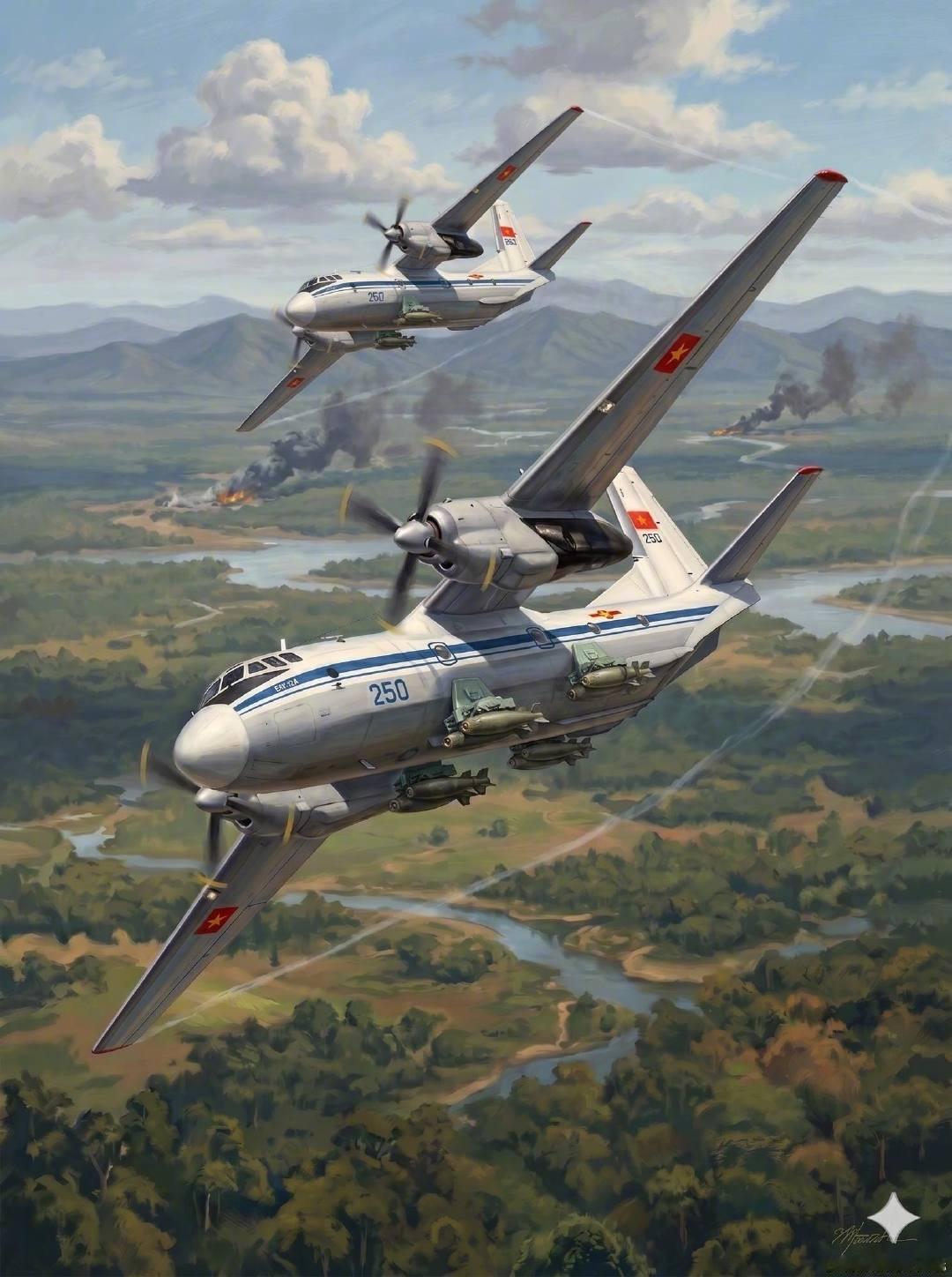 最吸引我的是第一幅,越南空军的AN-24执行轰炸柬埔寨红色高棉的任务,机腹下的炸弹和挂架细节栩栩如生。后来又翻看了下这位画家的作品,感觉飞机动态非常单一,背景也有不少是强行拼凑,透视和光感都一般般,就懒得挖掘细节了。有兴趣的可以按照右下角署名自己去找来看看。航空君航空科普 航空创作计划 烽火问鼎计划