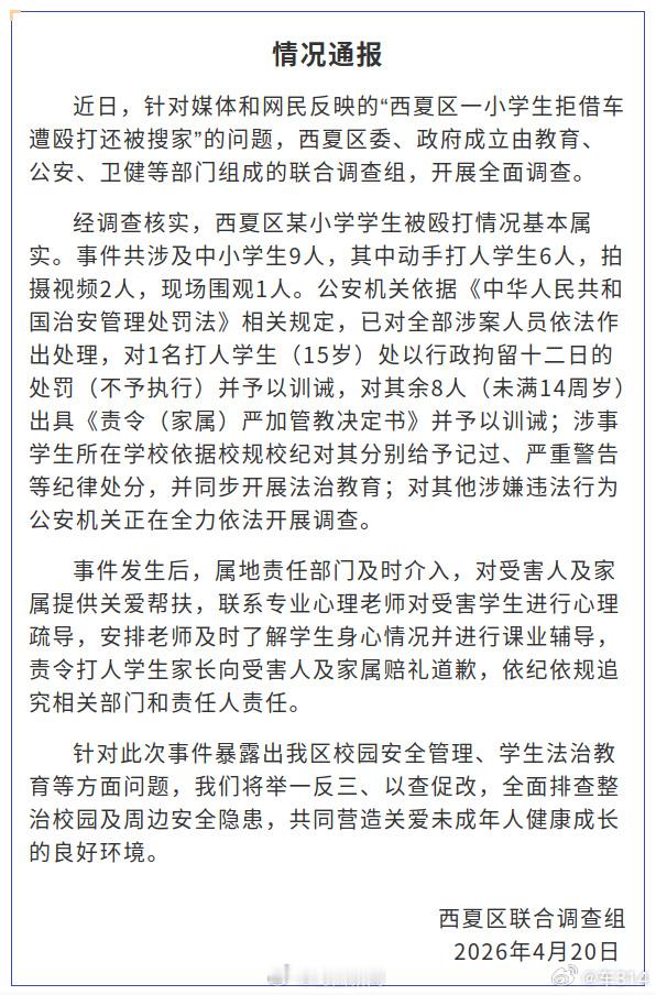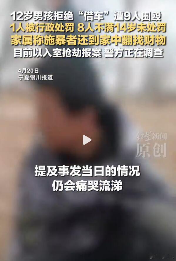 校园暴力甚至都不是什么新鲜话题了,很多人都麻木了,谁小时候上学没被霸凌过,那才算新闻。受害者只是因为不想把车子借给同学玩,就被众人殴打,而结果只是1人被行政拘留,而且还并非送到拘留所;其他8人不满14岁,不会被拘留,只是训诫,到最后也不会有什么实质性的惩处。民事赔偿应该会有,但也只是施暴者的家长去承担。就一句“他还是个孩子”,就能脱罪了?就很好奇,我们的《未成年人保护法》,究竟保护了些什么?难道真的是《未成年人渣保护法》?小学生拒绝借车遭殴打搜家细节曝光6人动手1人被行拘 8人被训诫小学生拒绝借车遭殴打搜家细节曝光未成年不是纵容恶行的挡箭牌小学生遭9人施暴绝不能大事化小