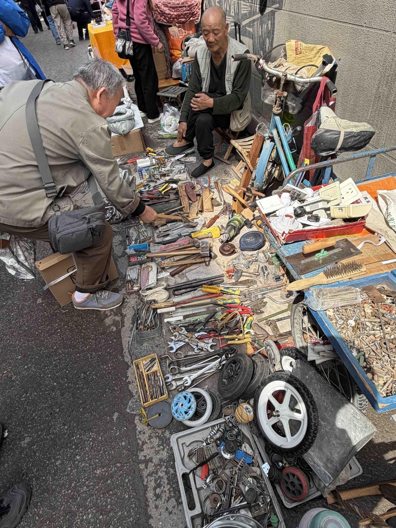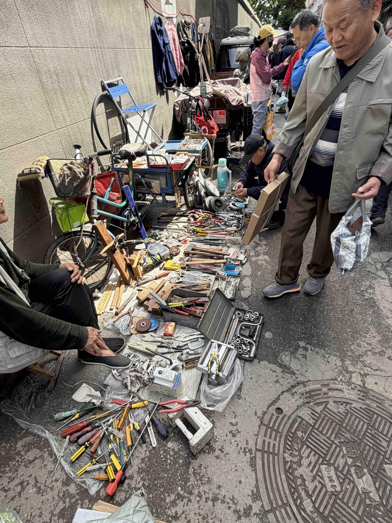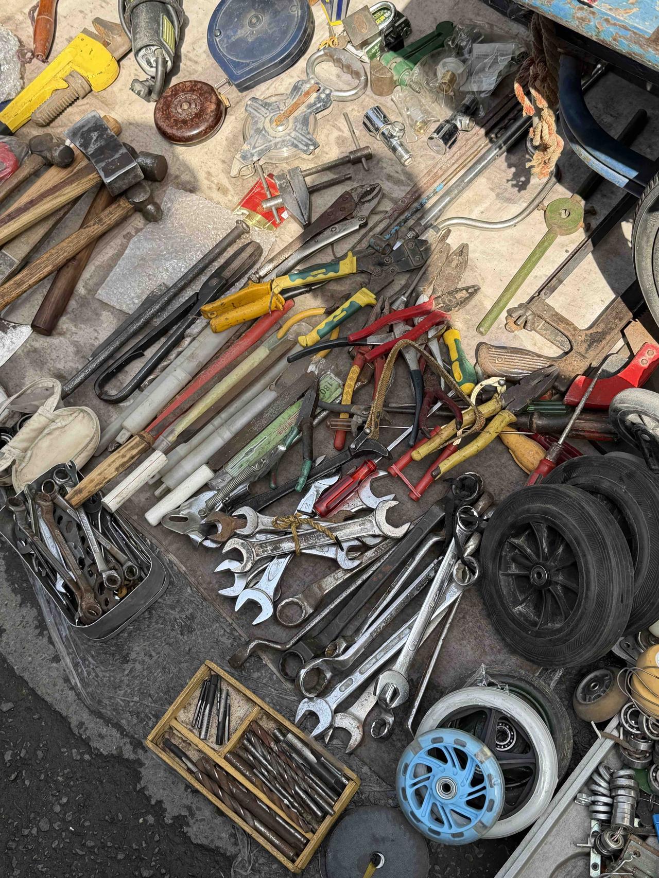 有顾客在摊子上选购,寻问一把旧榔头的价。