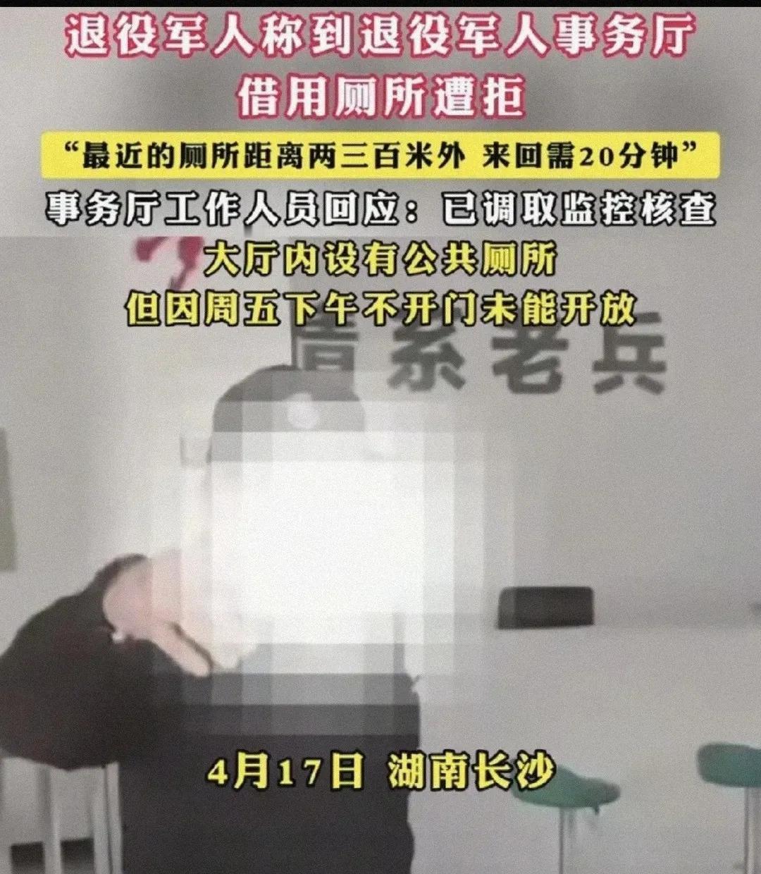 湖南长沙一位右腿受伤走路靠拐杖的退役军人,内急到浑身发抖,求保安放他进退役军人事务大厅借个厕所。