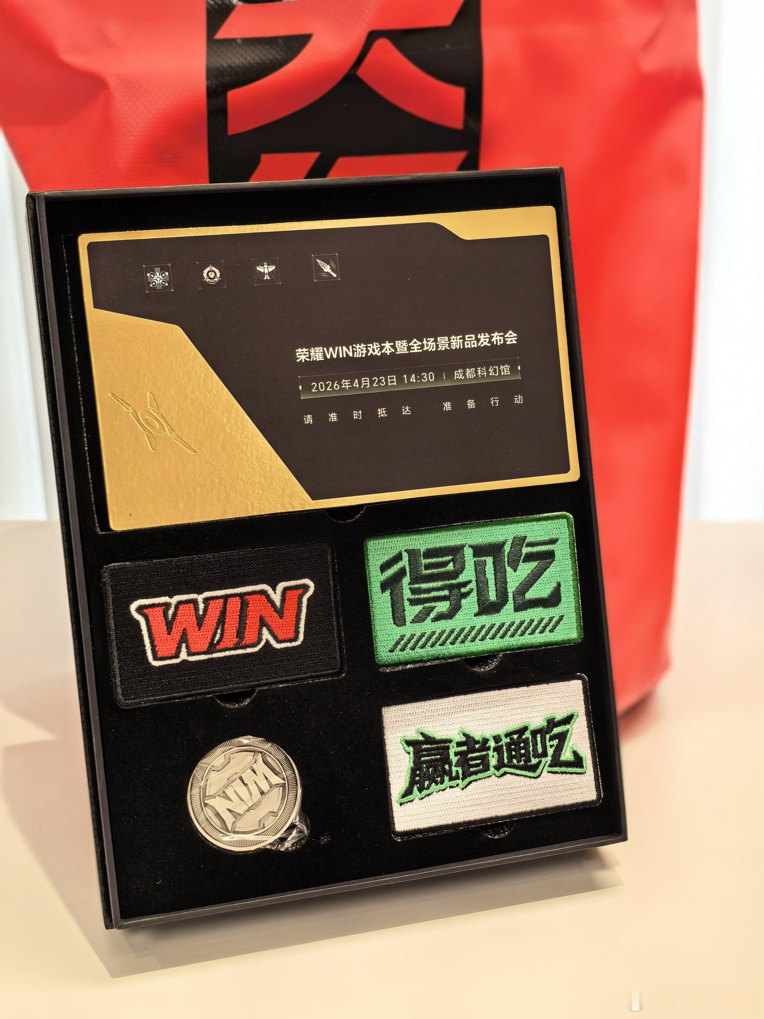 我滴天!荣耀这波操作也太有创意了!荣耀WIN游戏本 发布会邀请函居然是巨型红包样式,拆开后不仅有官方邀请函,还有趣味魔术贴和定制纪念币,惊喜满满!鼠鼠WIN赢包零食无限续杯,游戏党必备补给直接安排到位!狠狠期待4月23日的发布会,坐等荣耀打洲本 惊艳亮相!