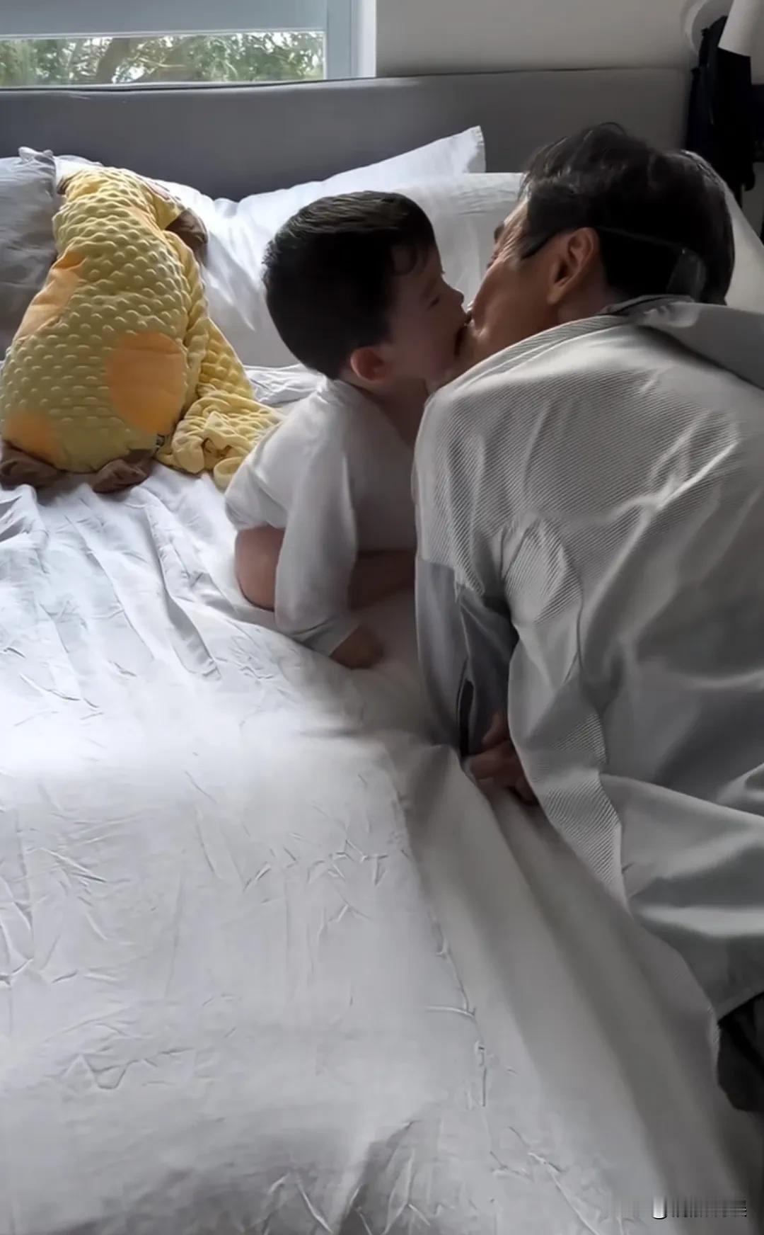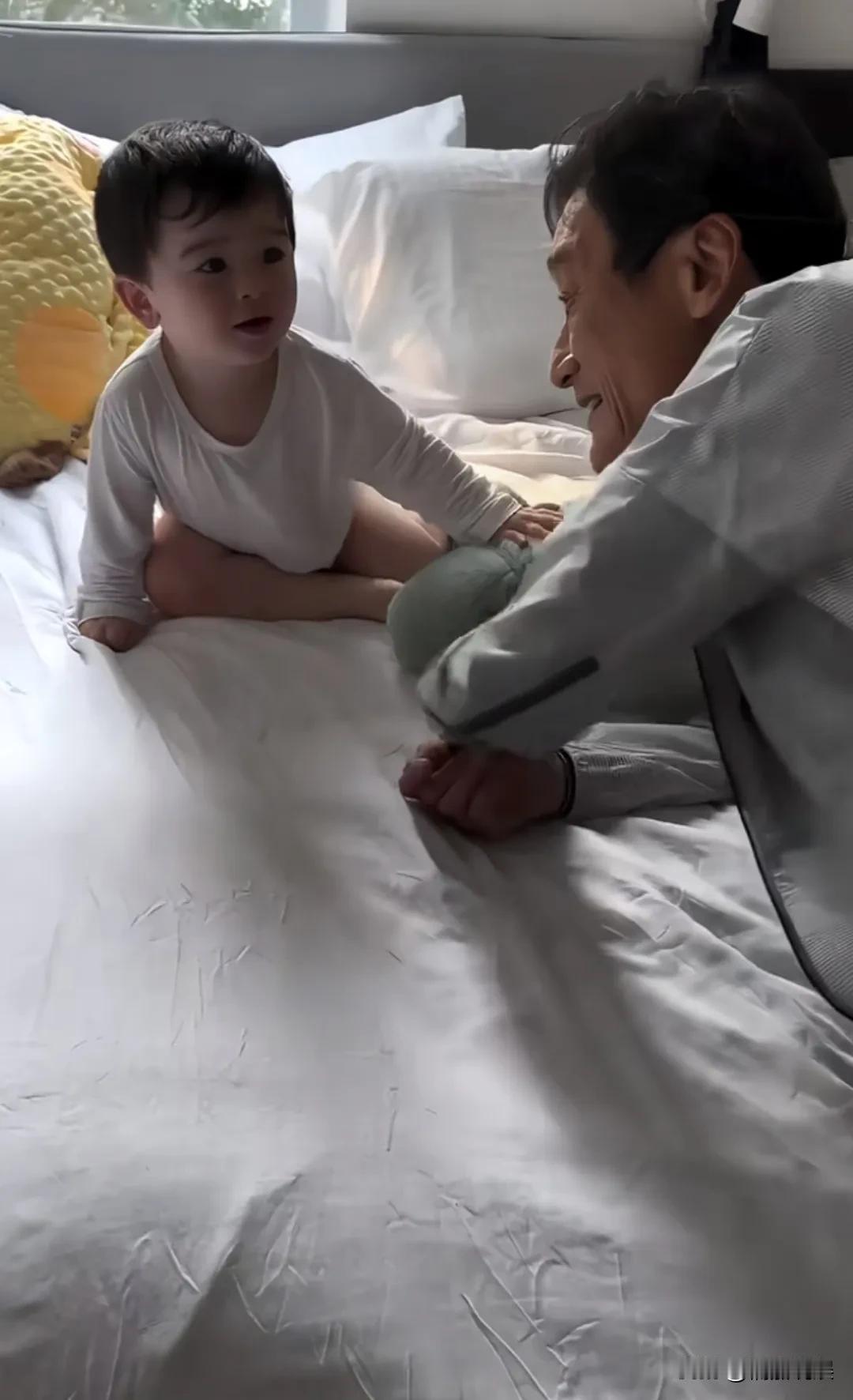 梁家辉女儿晒视频,自己的儿子和父亲一起互动的情节。小家伙一岁多一点,是个大眼萌宝,肉乎乎的,好可爱。梁家辉穿静静的趴在床边,满脸皱纹,一脸笑意的看着小宝贝。