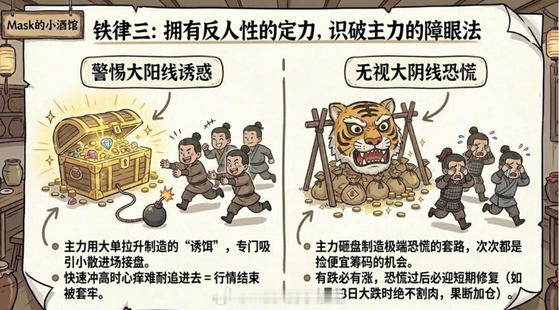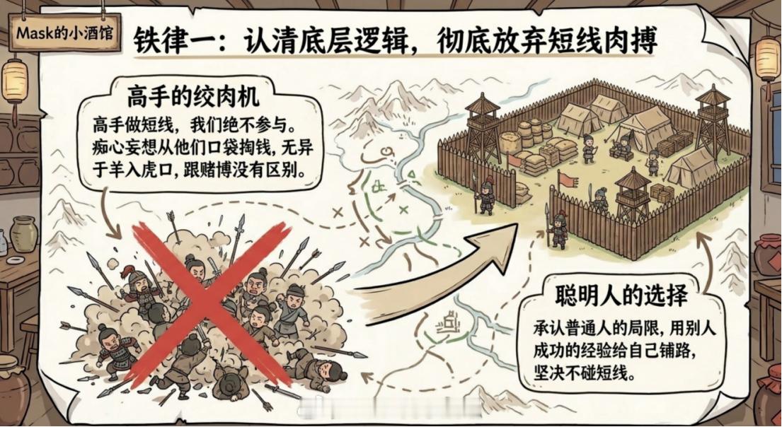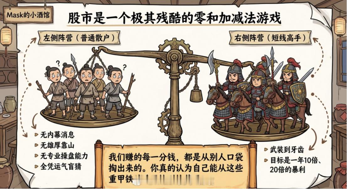 好,第一句,首先我们得理解炒股挣钱的底层逻辑。股市是什么呢,它是一个加减法游戏,我们赚的每一分钱,都是从别人的口袋里掏出来的。这个市场有很多高手,做短线一年10倍20倍的大有人在。而我们只是普通人,一没内幕,二没靠山,三没专业能力。