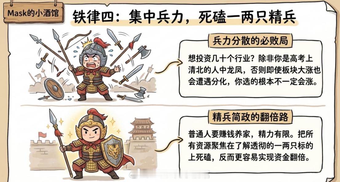 第四句,拿住一两只好股票死磕,反而更容易实现翻倍。你想想,普通人想在股市里投资科技、买买消费,这么大几十个行业,怎么可能都做成功啊?如果你有那个本事,高考的时候就轻松上清华北大了,工作的时候也一定是行业的人中龙凤。而我们大部分都是普通人,要赚钱养家的,平时看看新闻、听下其他博主的推荐,一下就把股票买了,即便是板块大涨,也会走出分化的行情,你选的公司和基金不一定会涨,这就是小散很难赚到钱的原因。