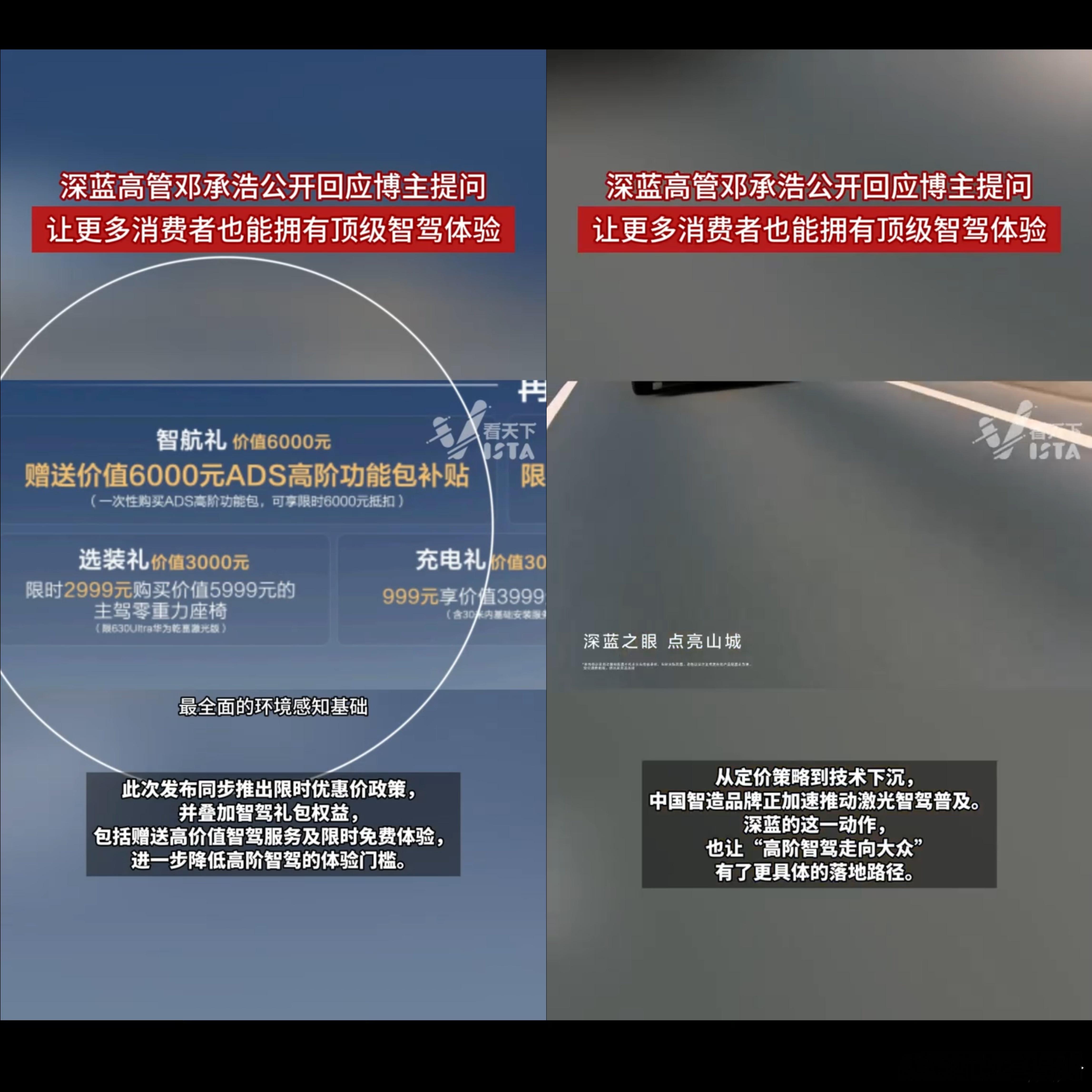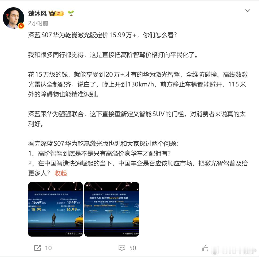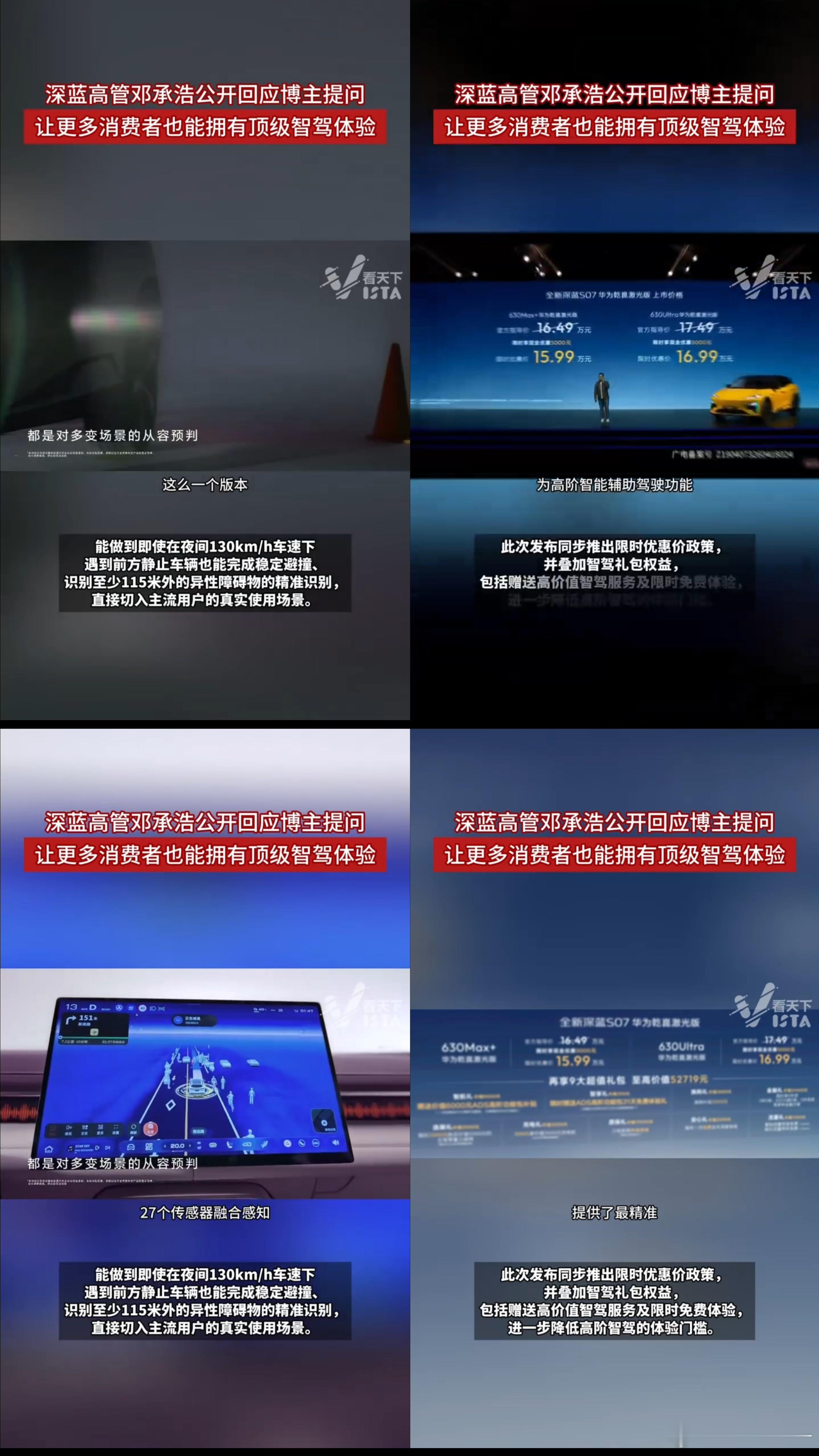邓承浩回应普及激光智驾 科技改变生活,开始普及智驾了。华为乾崑激光雷达装入S07,15万级独有。安全能力突出,夜驾高速稳定应对。深蓝主动放弃高溢价,推动技术真正服务于众。
