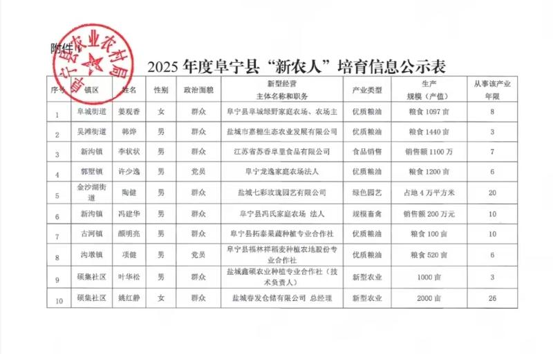 阜宁县2025年“新农人”培育名单公示,涉及姜观香、韩烨、李状状、许少逸、陶健、冯建华、颜明亮、项健、叶华松、姚红静共10名培育对象,人员覆盖阜城街道、吴滩街道、新沟镇、郭墅镇、金沙湖街道、古河镇、沟墩镇、硕集社区等多个镇区,经营领域涵盖优质粮油、绿色园艺、规模畜禽、食品销售、新型农业等多元业态,均为当地家庭农场、农业企业、专业合作社等新型农业经营主体负责人。