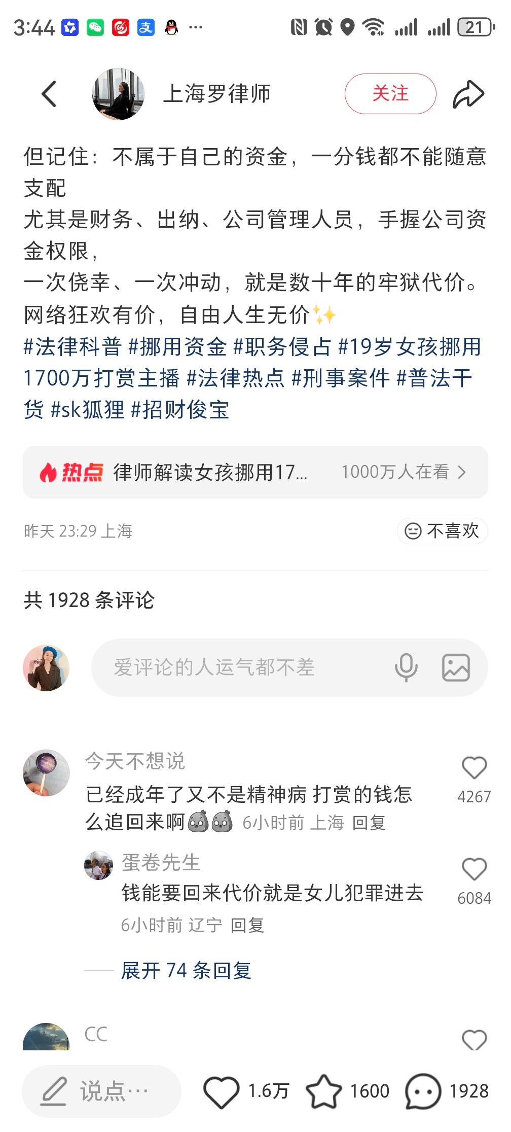 挪用1700万打赏女孩父亲已基本破产 律师告诉你19岁挪用1700万做榜一大姐到底犯了什么罪?
