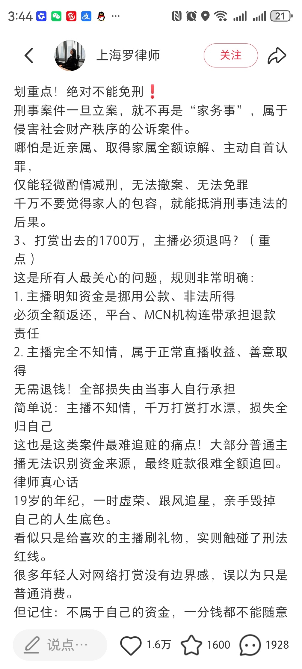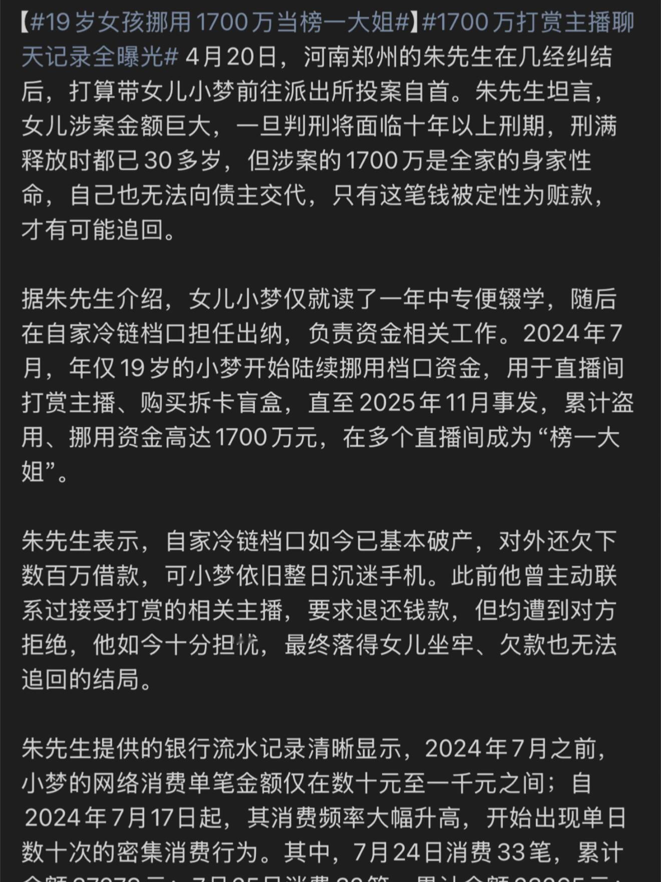 挪用1700万打赏女孩父亲已基本破产 律师告诉你19岁挪用1700万做榜一大姐到
