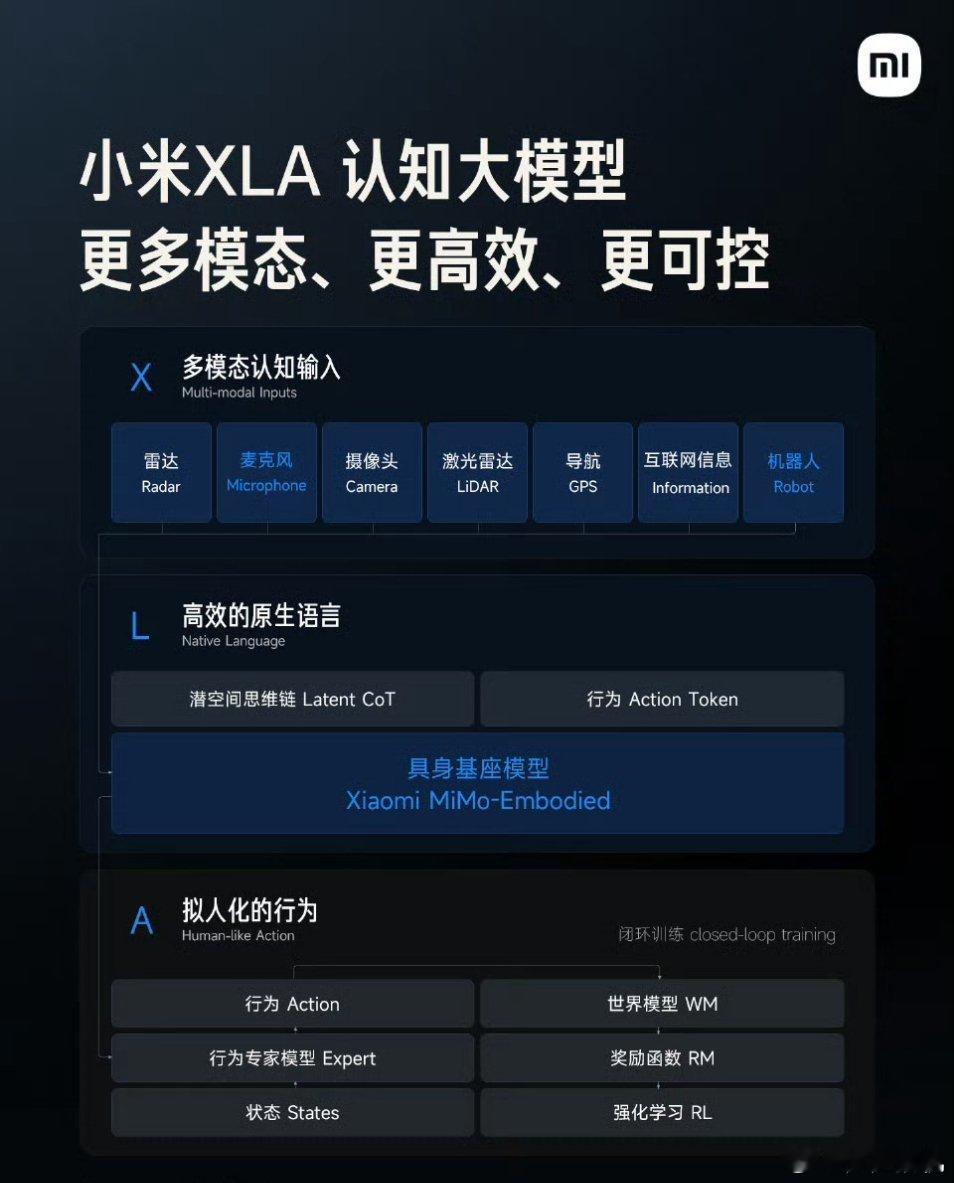 小米新SU7XLA大模型揭秘,让我们看到小米在辅助驾驶领域的突破性进展。通过自研的MiMo-Embodied技术,小米首次将辅助驾驶与具身机器人任务打通,XLA大模型在端到端学习和世界建模上展现显著优势。车是最先落地的具身智能