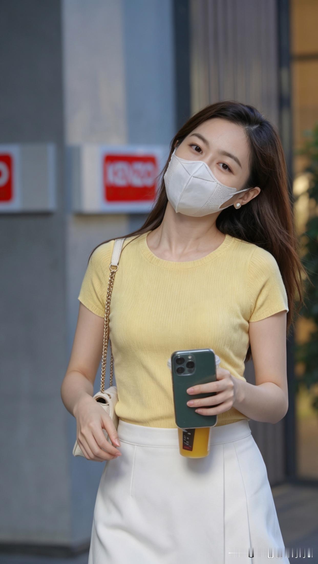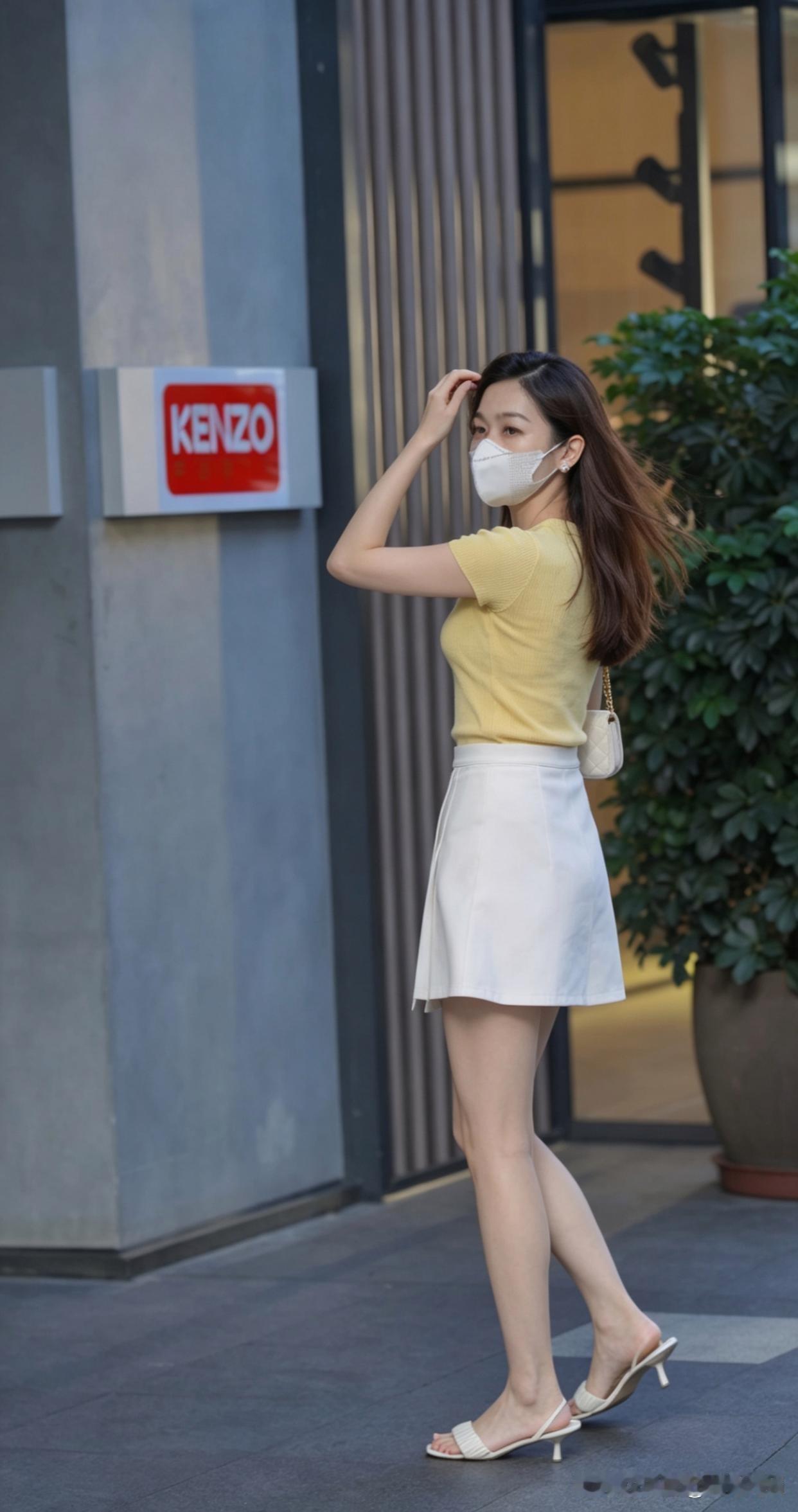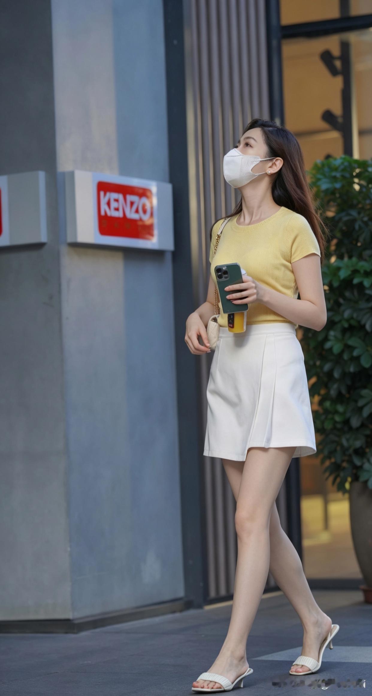 今天出门,看到一位女士在户外美得发光。她穿着黄色上衣和白色裙子,这搭配简直太妙了