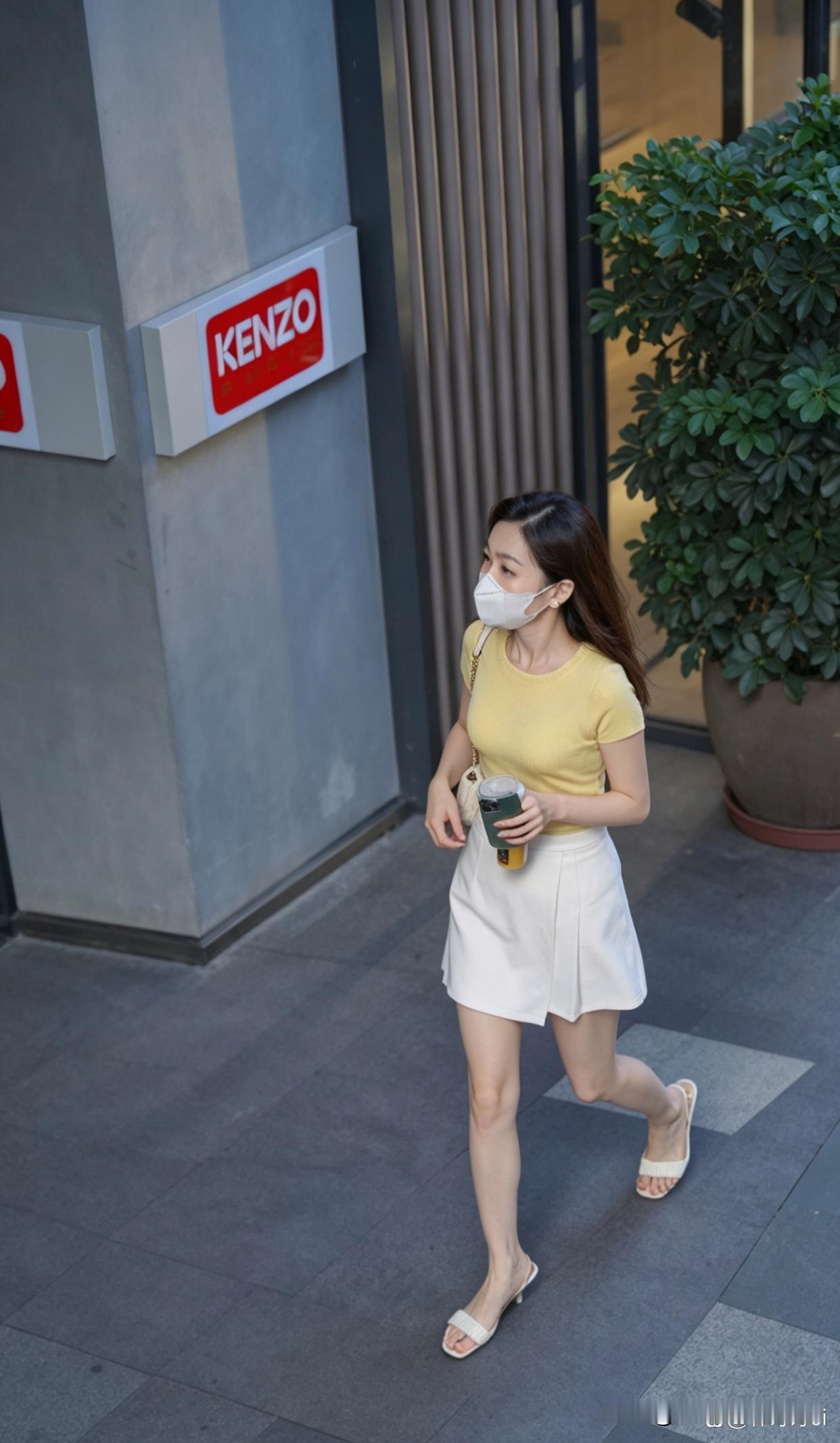 今天出门,看到一位女士在户外美得发光。她穿着黄色上衣和白色裙子,这搭配简直太妙了。