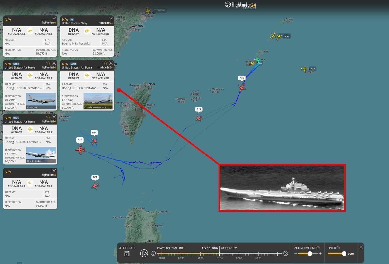 当地时间2026年4月20日,美国方面总结了,根据世界航行航线系统的数据,中国海军辽宁号航母通过台湾海峡时,美军紧急派出多架RC-135U电子侦察机和P-8A反潜机进行监视,并由两架KC-135空中加油机提供协助。从数据图来看,美军大批电子侦察舰,反潜机,加油机是从琉球群岛起飞的,这是自从美军打伊朗以后,包括停战期间,美军最新,最大在西太平洋调动航空力量,并且还是针对中国海军辽宁号航母的动向。