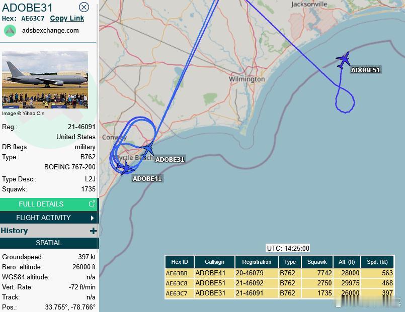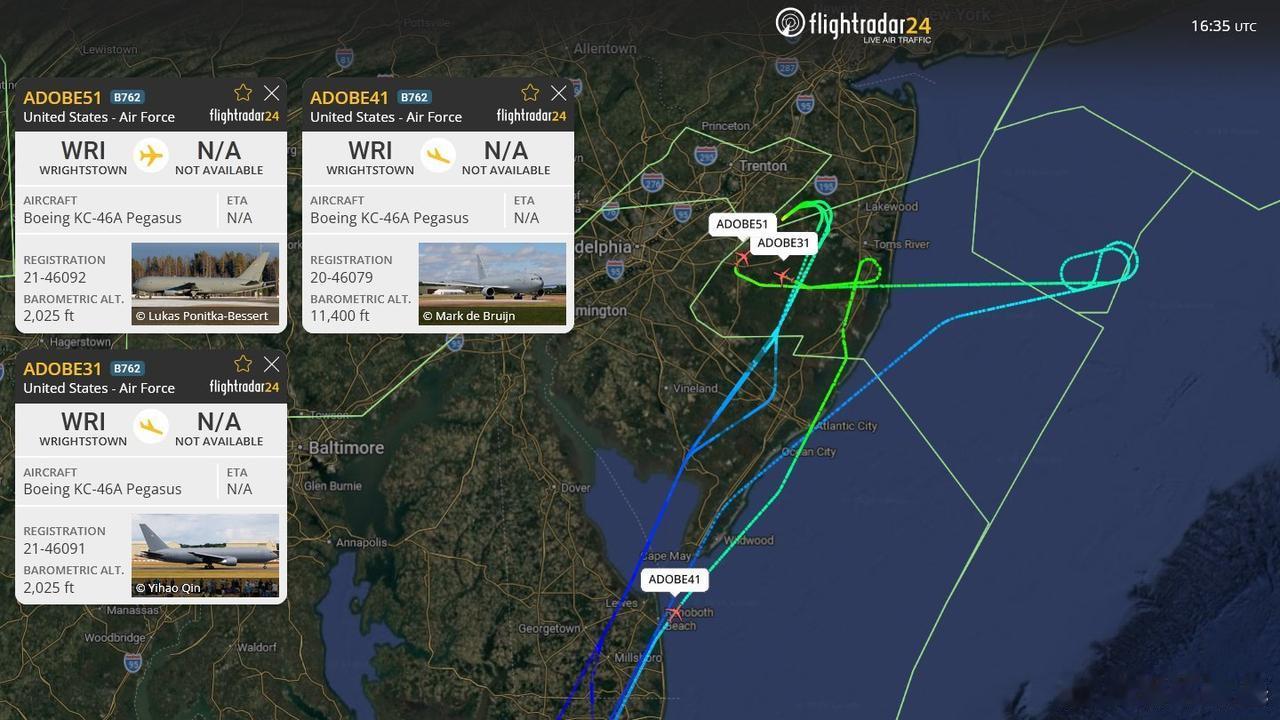 这些“咆哮者”电子战攻击机刚抵达葡萄牙拉热斯空军基地,这个部署将使美军中央司令部责任区的咆哮者总数增加到36架。本次部署使用3架KC-46A,由于两架EA-18G的技术问题,飞行又延误了24小时。这三架KC-46A的编号与呼号,与DefenceGeek此前报道的Coronet East 052任务中的加油机完全一致。该任务最初传闻涉及F/A-18A/C ,目前机型尚未最终确认(可能为EA-18G、F/A-18A/C,或包含F-35B的混合编队),整体规模接近一到两个中队。从加油机轨迹看,更符合USMC F/A-18转场特征,它们在费城以东海域盘旋等待,起飞基地最可能是位于北卡罗来纳州的美海军陆战战队第2海军陆战航空联队所在地樱桃角航空基地,因此这批转场更可能以海军陆战队的F/A-18A/C为主。