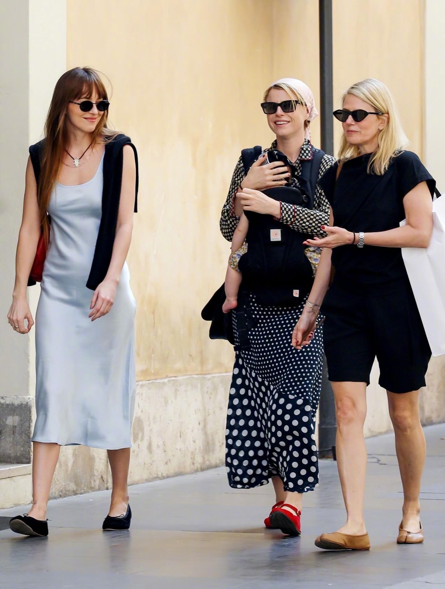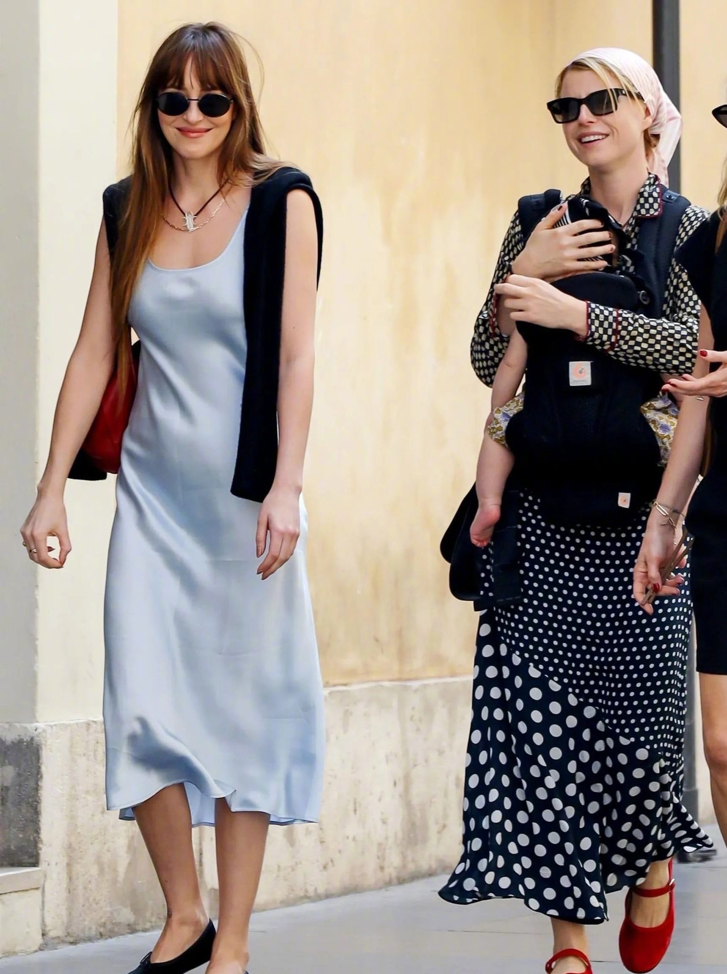 达妹DakotaJohnson 和 Jessie Buckley 现身罗马街头。两位用截然不同的方式演绎了同一种暖季穿搭公式。Johnson 延续一贯的极简风格,而 Buckley 则是极繁时尚表达自我。达妹身穿homeofhai蓝色佛罗伦萨连衣裙,脚穿平底芭蕾鞋,肩背The row保龄球包。米拉服饰解析