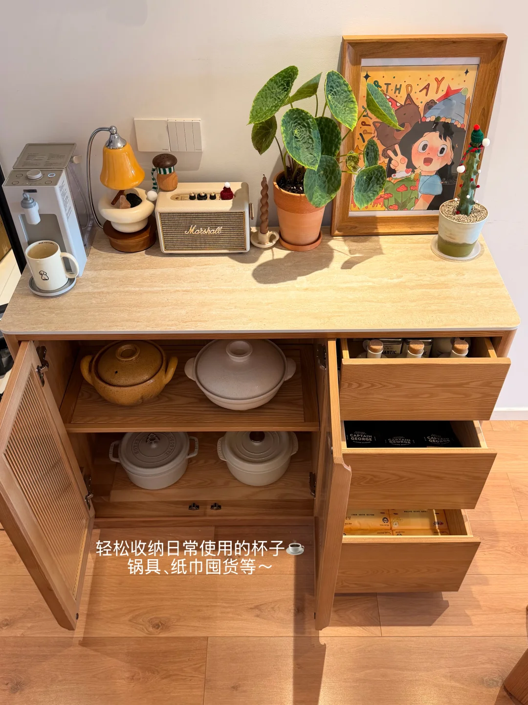 平时放饮水机、杯具、零食,台面摆一盆绿植