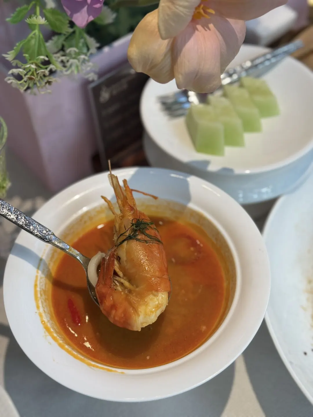 ✅冬阴功汤:用虹吸壶现煮的,汤底鲜到跺脚,罗氏虾肉质紧实,酸辣度刚好,喝一口直接开胃