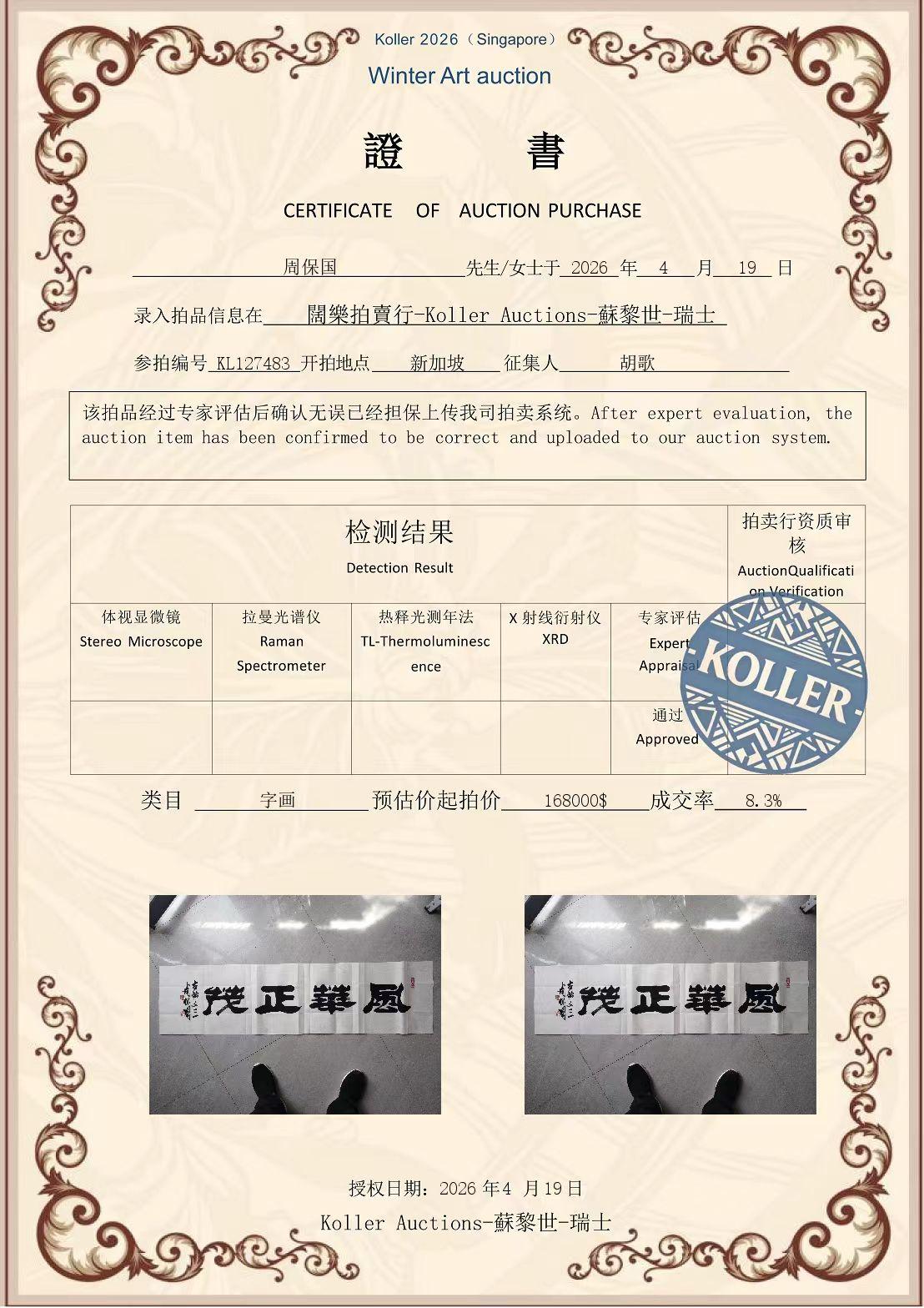 中国书法家协会会员、CCTV《藏宝天下》栏目艺术总监、“中国百强书画家”周保国先生的书法作品《风华正茂》,目前进入瑞士苏黎世阔乐拍卖行拍卖名录。经有关专家预估评审,周保国先生的该书法作品,起拍价定为16.8万美元,折合人民币117.6万元。