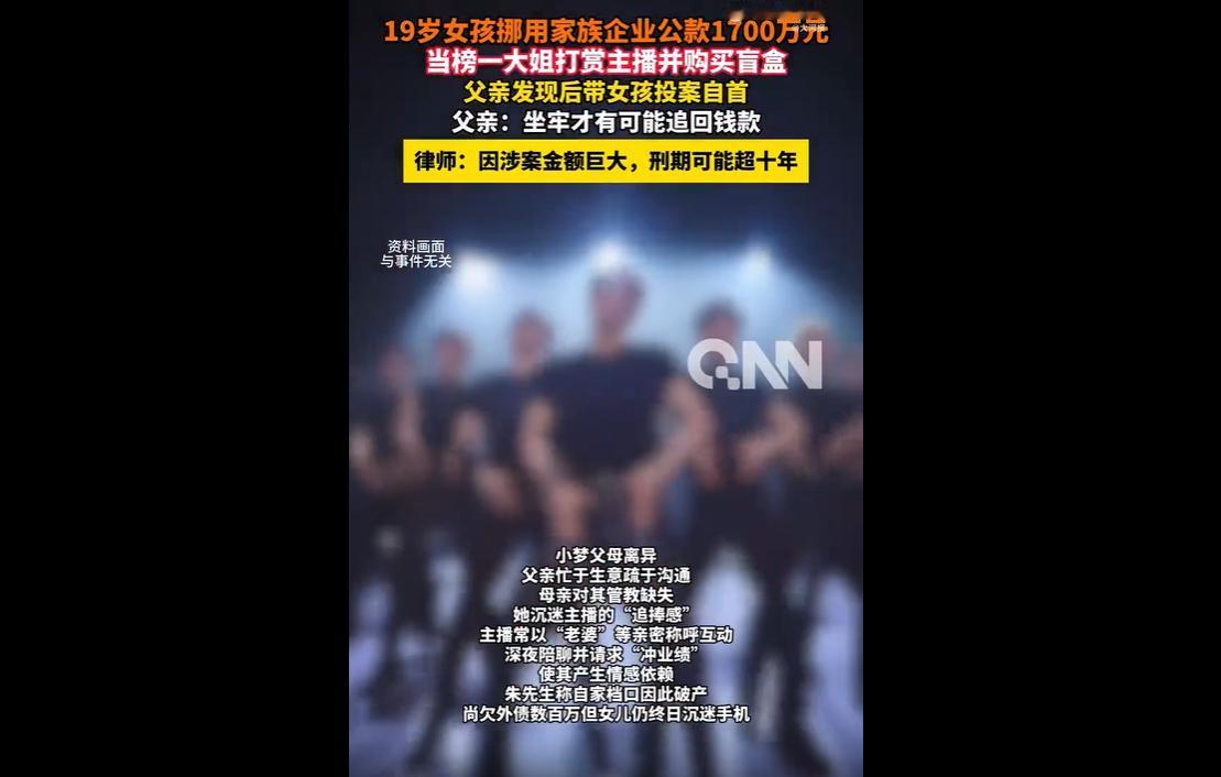 19岁中专辍学女孩,因家庭监管缺位、情感空虚,在16个月内(2024年7月至2025年11月),挪用家族企业1700万公款打赏主播、购买盲盒,单日最高消费57笔、单笔达10万元,直至企业资金链断裂才暴露。
