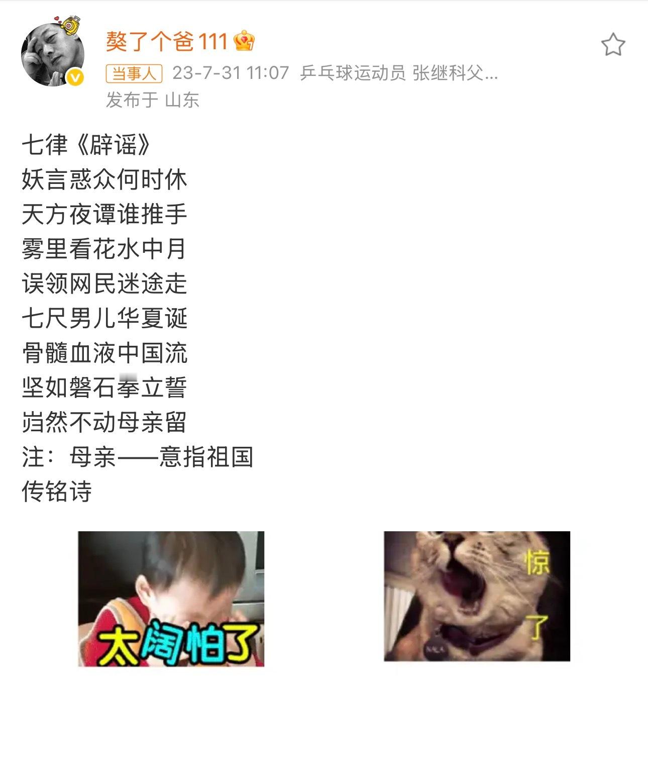 张继科说祖国荣誉高于一切 上一次张继科辟谣去日本执教是25年6月,上一次张继科父亲辟谣张继科不会去国外是23年7月,所以要这一家人说多少次自己只爱祖国母亲才行