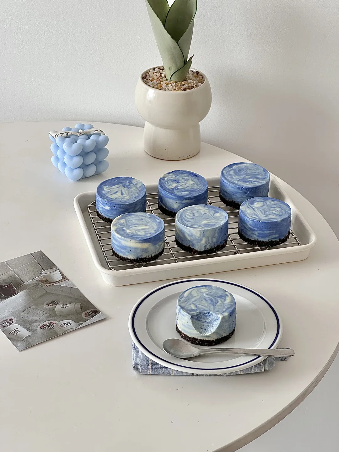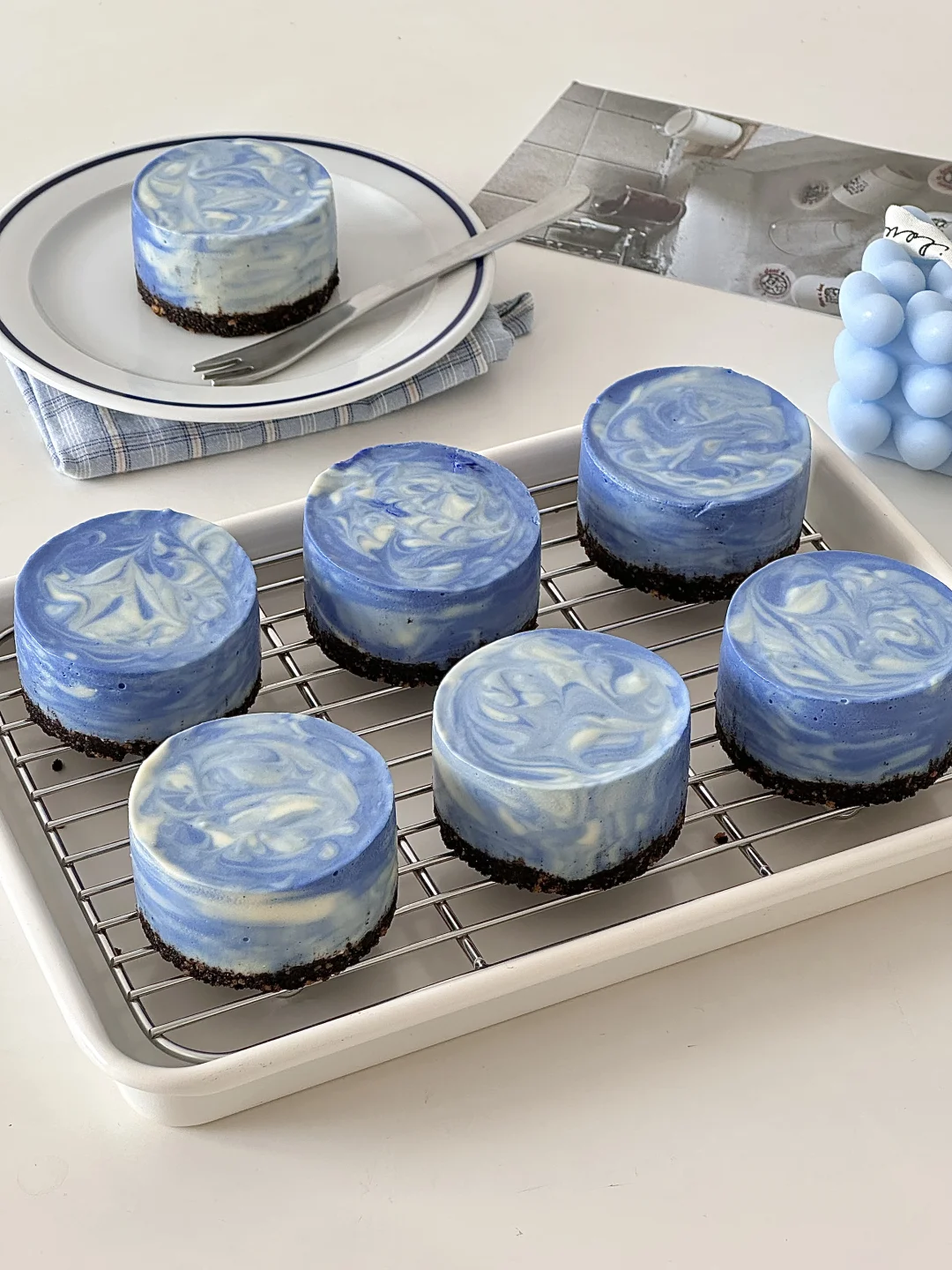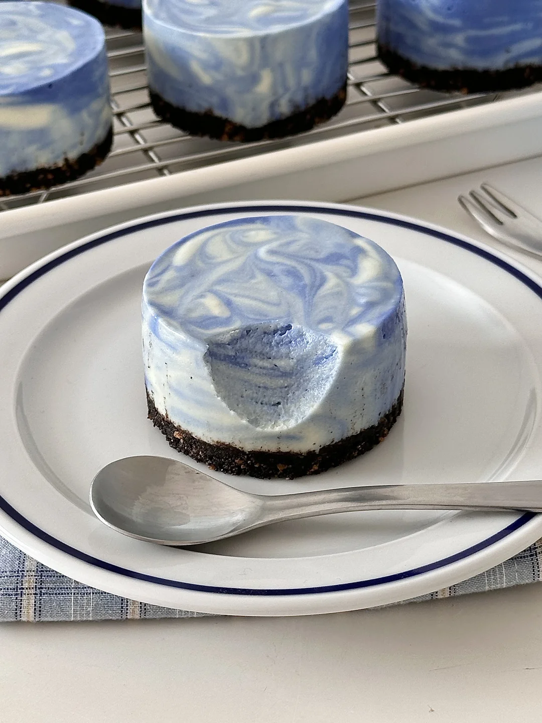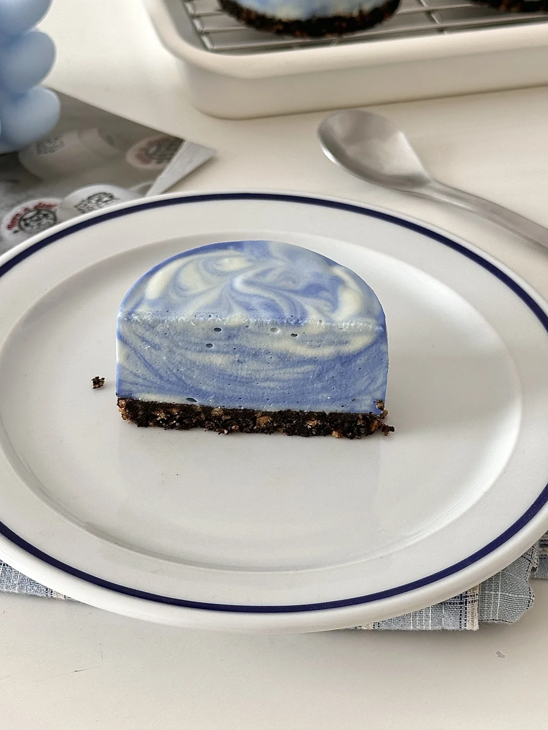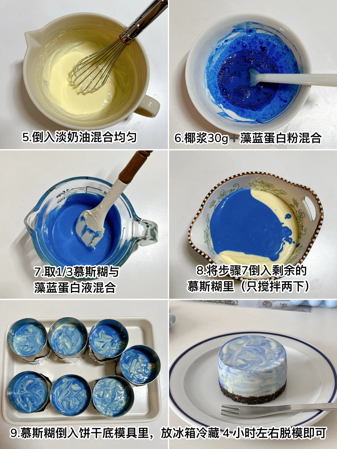 ❺取出1/3慕斯糊与藻蓝蛋白粉液混合均匀匀,然后倒入剩余的慕斯糊里搅拌两下,再倒入饼干底模具中,入冰箱冷藏❄4小时左右脱模即可
