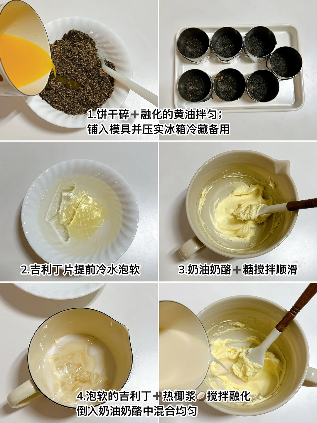 ❶饼干碎➕融化的黄油拌匀,压入模具冰箱冷藏