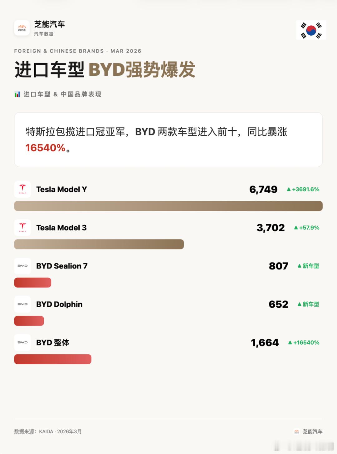 亚洲车市 | 韩国2026年3月:比亚迪销量1664台