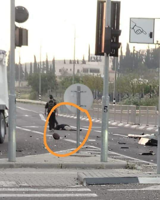 附图显示了事故现场,包括受损车辆、以色列国防军士兵、以色列红十字会救护车、道路碎片以及遇难者的照片。