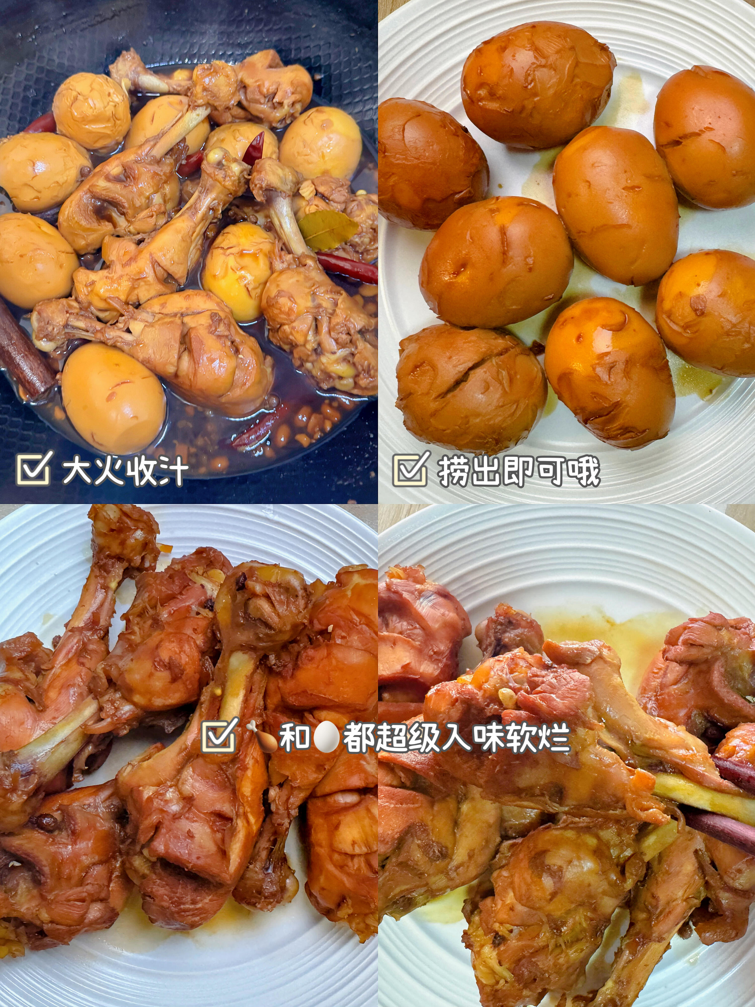 小Tips:关火后不要着急捞,让鸡腿和鸡蛋在卤汁里浸泡1小时,入味会更足!喜欢甜口可以多放2颗冰糖,偏爱辣味就多加一把干辣椒,根据自己口味调整超方便~