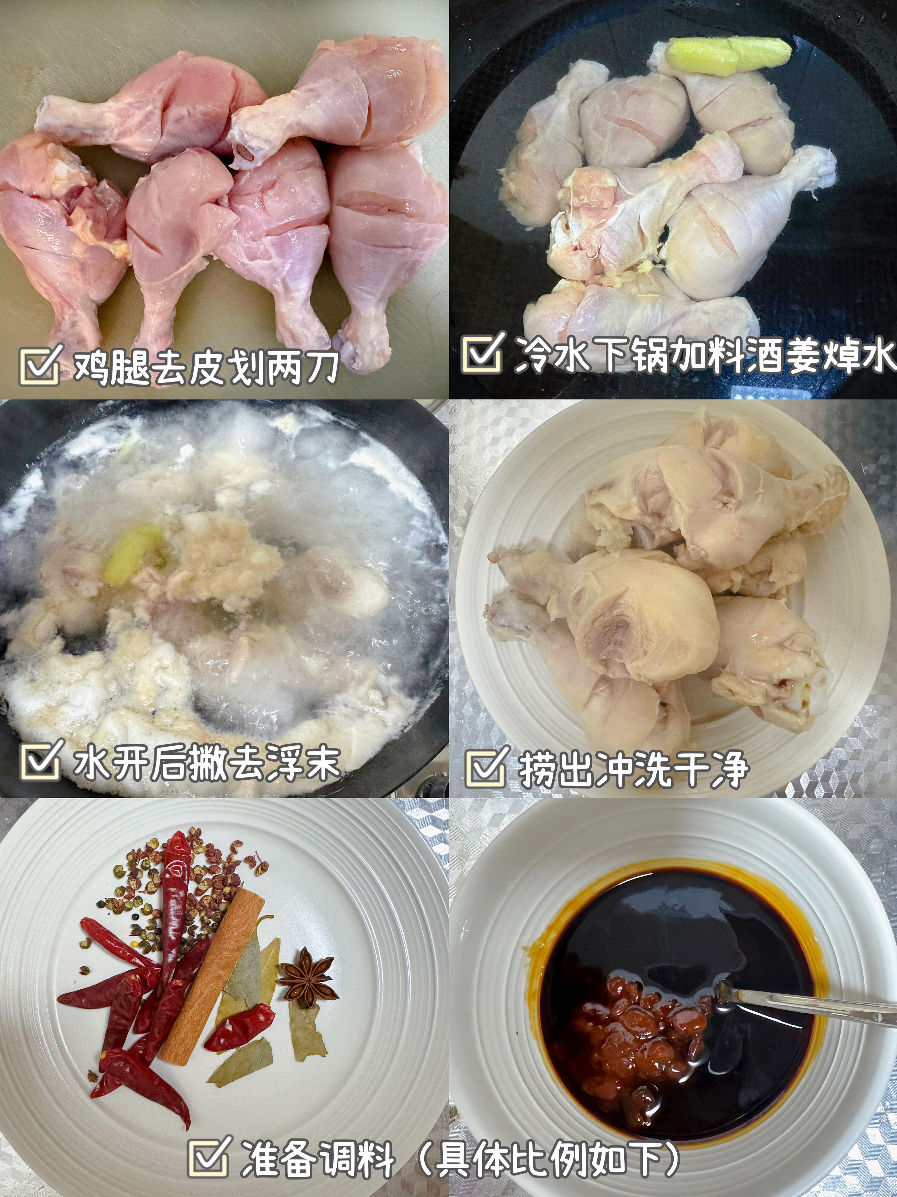 1️⃣ 鸡腿去掉外皮,正反面各划两刀(方便入味),冷水下锅,加入料酒和姜片,焯水后捞出,用温水冲洗干净沥干水分。