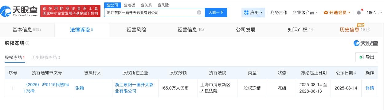 风险信息显示,张翰名下浙江东阳一画开天影业有限公司存在股权冻结信息,被执行人为张翰,冻结股权数额165万。此外,今年以来,上海张翰影视文化工作室因承揽合同纠纷被2次起诉。
