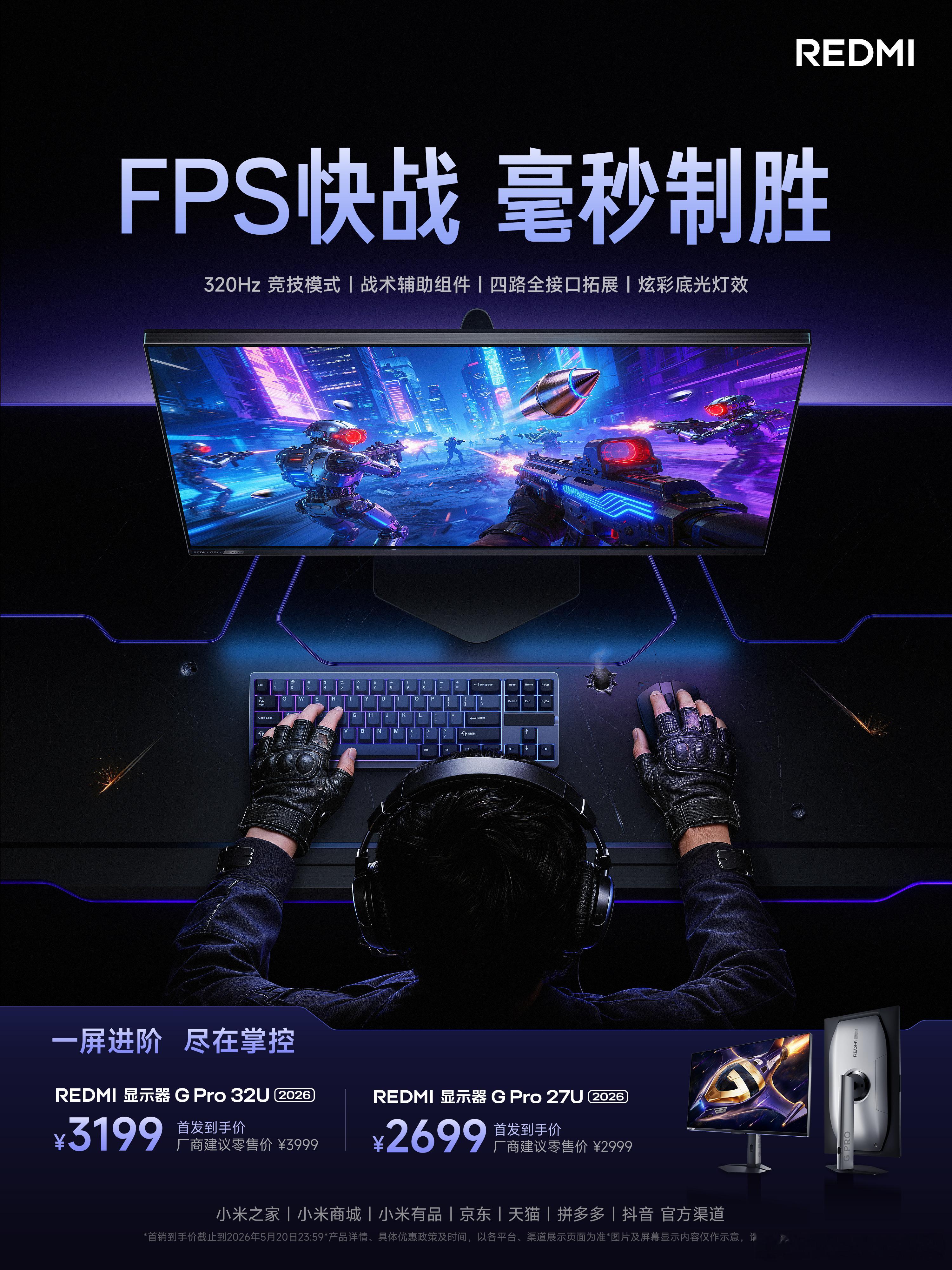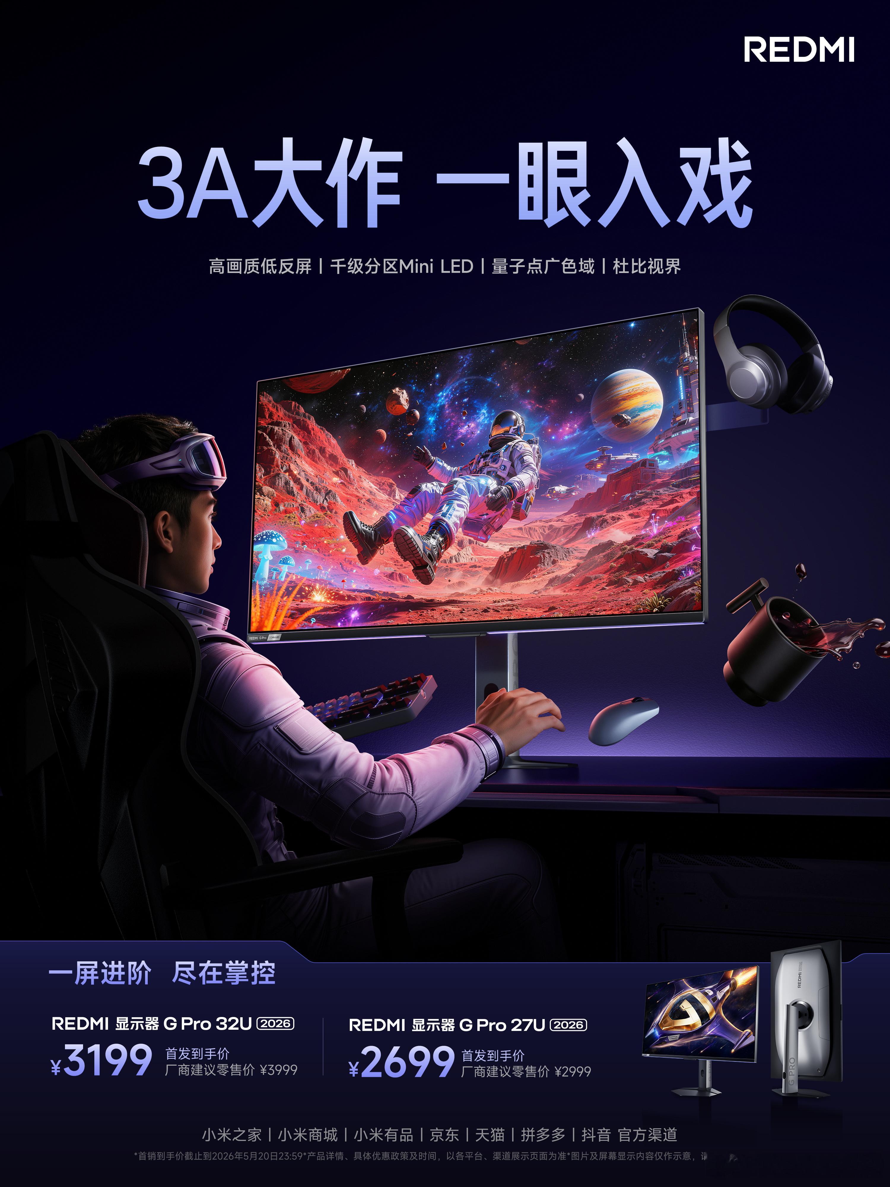 红米显示器更新,分为32英寸和27英寸,G Pro 2026系列,有双高刷模式切换功能,这次电视系统,驰骋 3A 大作、激战 FPS 赛场,首发优惠,到手价2699起。REDMI显示器REDMI显示器GPro3A玩家终极答案
