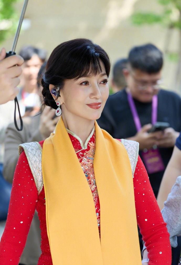 赵雅芝这回特意把头发挽了起来,还搭配了奢华的耳坠,真的是非常的漂亮。