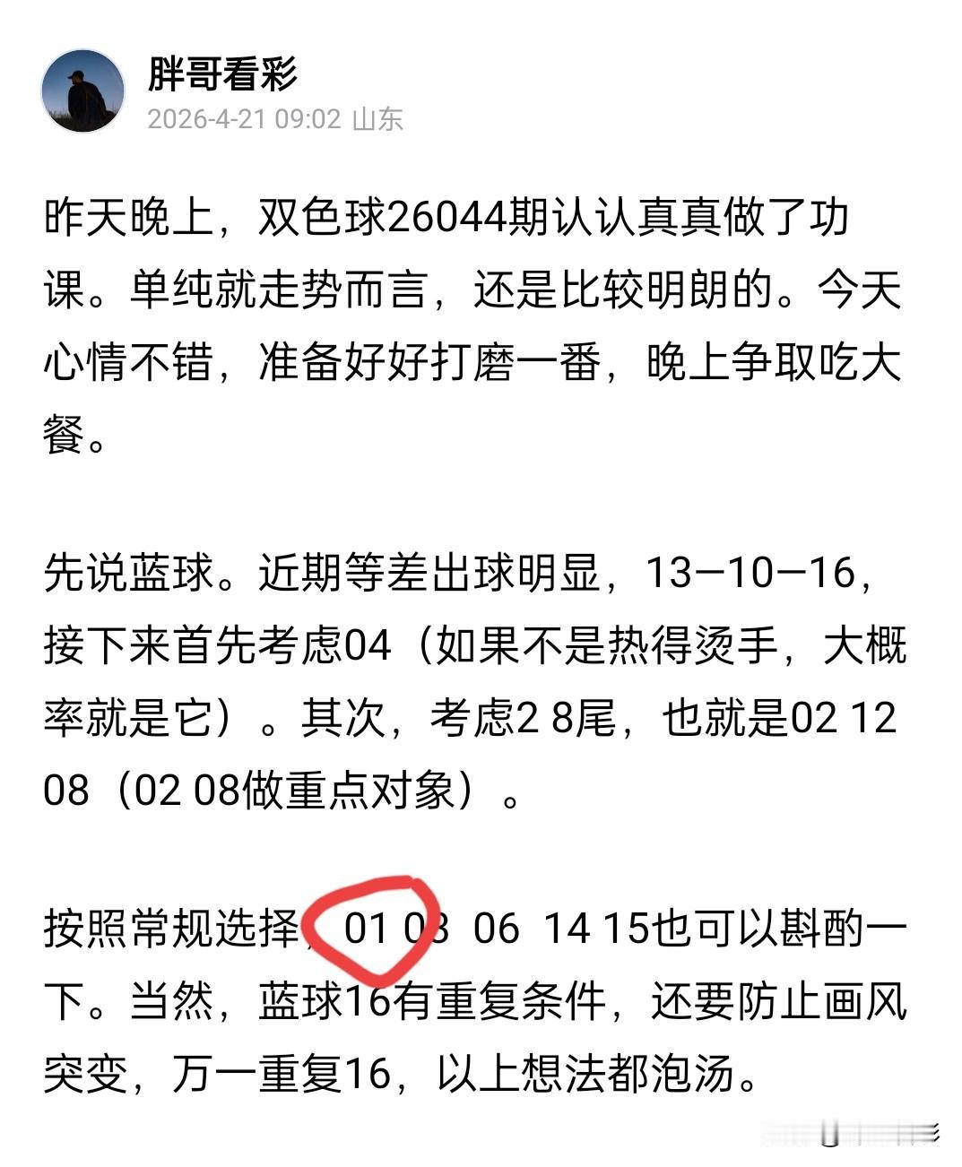 今天看丹丹的精选,我心里咯噔一下。因为我的杀号就是01 11 33,跟她截然相反。幸亏没有被带沟了,坚持了自己的看法。